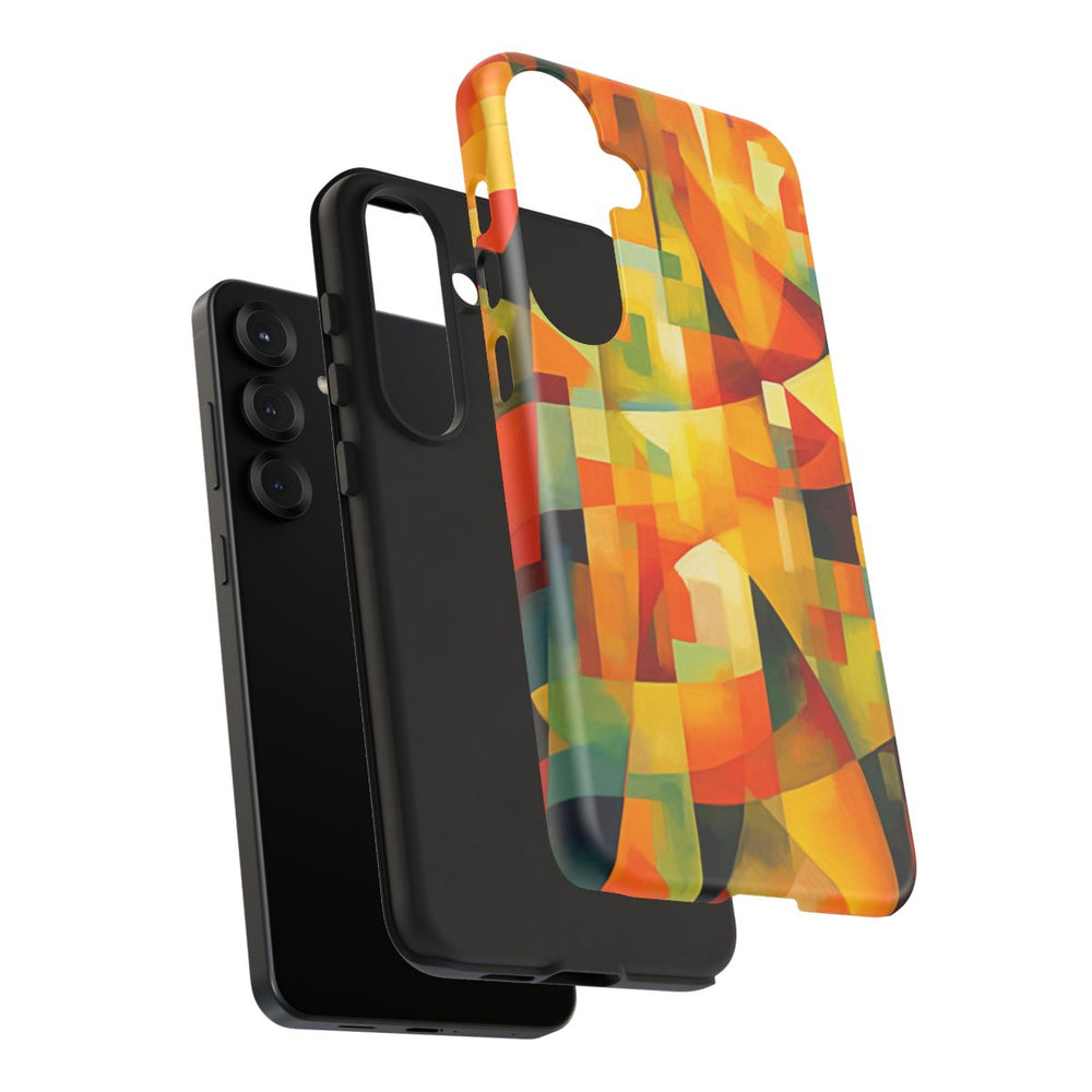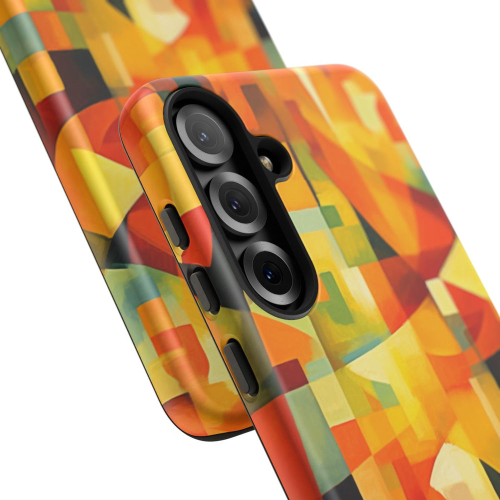 Dit ontwerp bestaat uit een abstracte, geometrische compositie met overlappende vormen en scherpe lijnen. De afbeelding gebruikt een rijk kleurenpalet met vooral warme tinten als oranje, geel en rood, aangevuld met accenten van groen en blauw. De vormen variëren van rechthoeken tot ronde lijnen, wat zorgt voor een dynamisch en boeiend visueel effect. De print is aangebracht op een mat telefoonhoesje van polycarbonaat en TPU met een dubbele laag voor extra bescherming en duurzaamheid. Het hoesje ondersteunt draadloos opladen en is bestand tegen weersinvloeden.