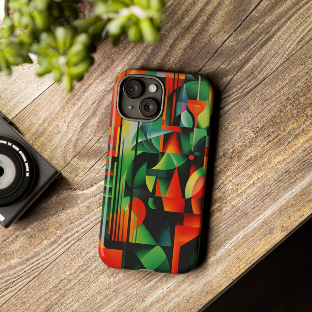 Dit hoesje heeft een abstract ontwerp met geometrische vormen die scherpe randen en overlappende structuren laten zien. De samenstelling bestaat uit een rijk kleurenpalet, waarin levendig oranje en groen de boventoon voeren, aangevuld met accenten van zwart, geel en roze. De vormen – cirkels, driehoeken en rechthoeken – zijn op een dynamische, gelaagde manier gerangschikt. Het hoesje bestaat uit twee lagen van polycarbonaat en TPU voor extra stevigheid en ondersteunt draadloos opladen. De moderne, artistieke stijl benadrukt krachtige kleurcontrasten en abstracte geometrie.