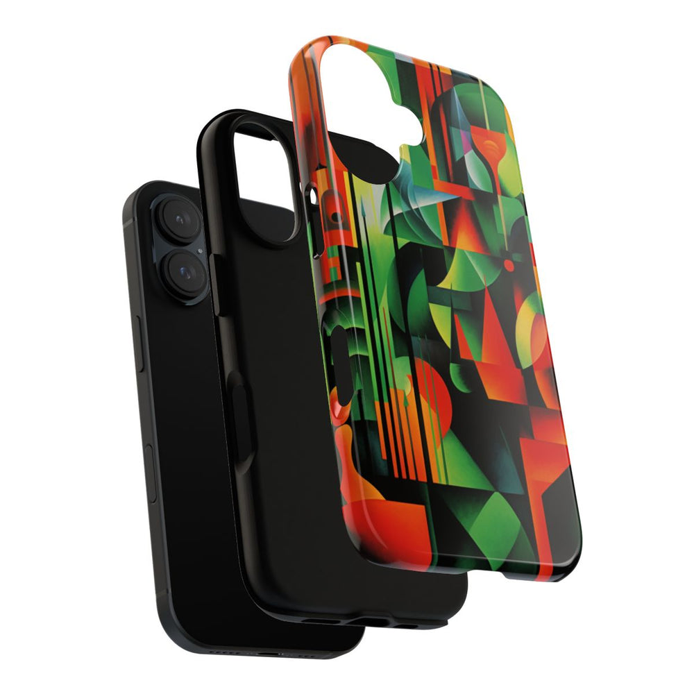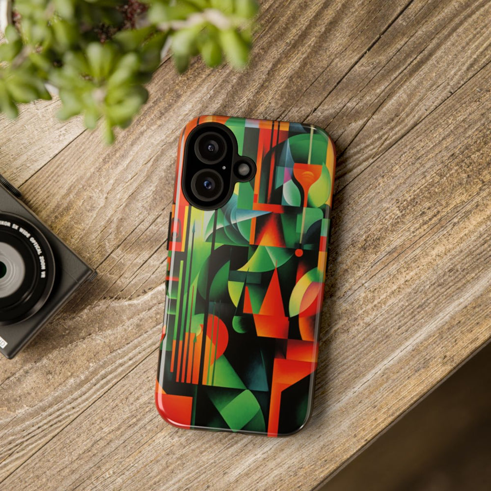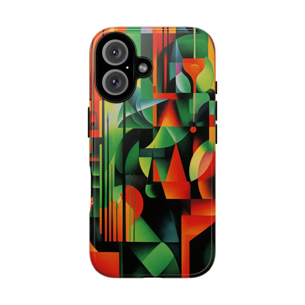 Dit hoesje heeft een abstract ontwerp met geometrische vormen die scherpe randen en overlappende structuren laten zien. De samenstelling bestaat uit een rijk kleurenpalet, waarin levendig oranje en groen de boventoon voeren, aangevuld met accenten van zwart, geel en roze. De vormen – cirkels, driehoeken en rechthoeken – zijn op een dynamische, gelaagde manier gerangschikt. Het hoesje bestaat uit twee lagen van polycarbonaat en TPU voor extra stevigheid en ondersteunt draadloos opladen. De moderne, artistieke stijl benadrukt krachtige kleurcontrasten en abstracte geometrie.