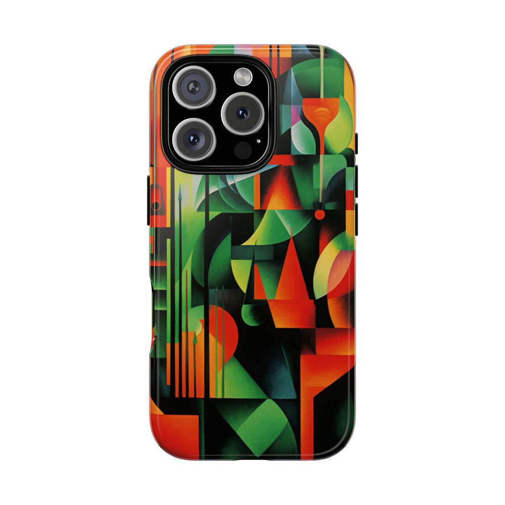Dit hoesje heeft een abstract ontwerp met geometrische vormen die scherpe randen en overlappende structuren laten zien. De samenstelling bestaat uit een rijk kleurenpalet, waarin levendig oranje en groen de boventoon voeren, aangevuld met accenten van zwart, geel en roze. De vormen – cirkels, driehoeken en rechthoeken – zijn op een dynamische, gelaagde manier gerangschikt. Het hoesje bestaat uit twee lagen van polycarbonaat en TPU voor extra stevigheid en ondersteunt draadloos opladen. De moderne, artistieke stijl benadrukt krachtige kleurcontrasten en abstracte geometrie.