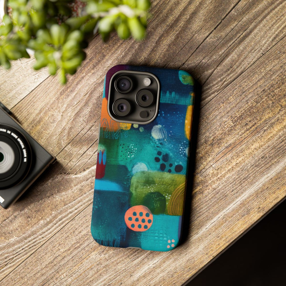 Dit hoesje is voorzien van een abstract ontwerp met geometrische vormen en patronen op een donkerblauwe achtergrond. Het ontwerp bestaat uit verschillende rechthoeken, cirkels en lijnen in levendige kleuren zoals turquoise, groen, oranje, paars, geel en rood. De vormen overlappen en versterken elkaar, wat zorgt voor diepte en dynamiek. Het hoesje heeft een stevige polycarbonaat buitenkant en een TPU binnenzijde voor dubbele bescherming en is geschikt voor draadloos opladen.