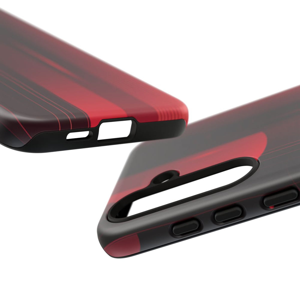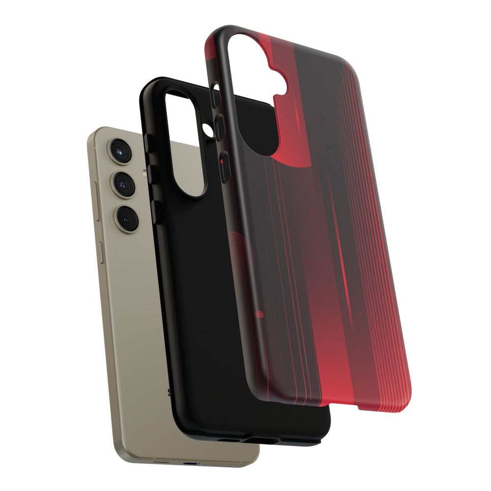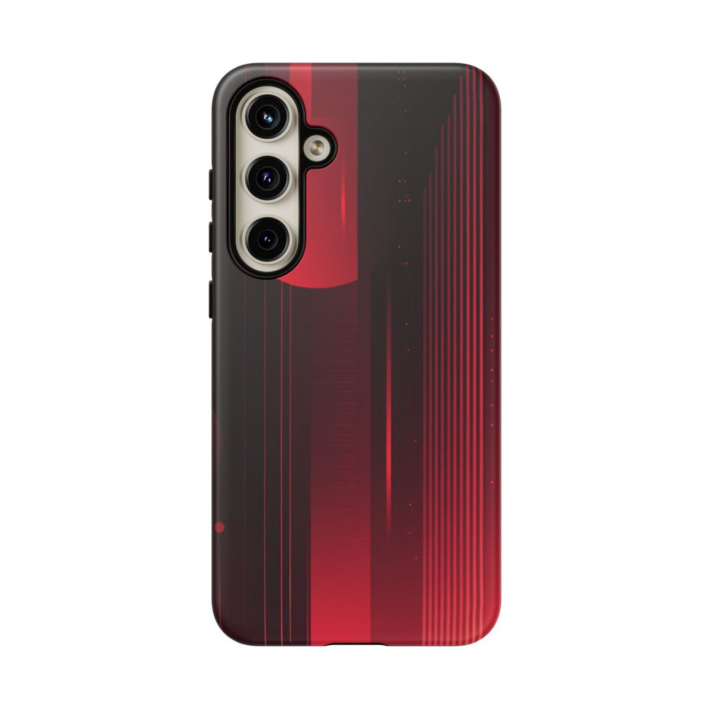 Dit hoesje heeft een minimalistisch ontwerp met abstracte geometrische vormen, waaronder cirkels en verticale lijnen. Het kleurenpalet bestaat uit donkere roodtinten zoals karmozijn en bordeaux, wat zorgt voor een opvallend visueel effect. Het geheel oogt modern en technisch, met gladde texturen en een stijlvolle toepassing van negatieve ruimte. Ideaal voor wie zijn toestel een eigentijdse uitstraling wil geven. Het hoesje is vervaardigd uit 100% polycarbonaat en 100% TPU voor optimale duurzaamheid en bescherming.