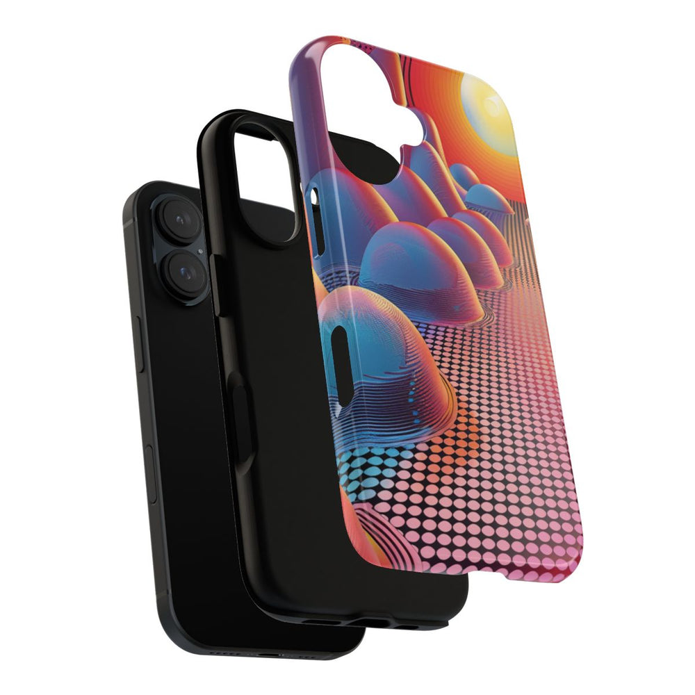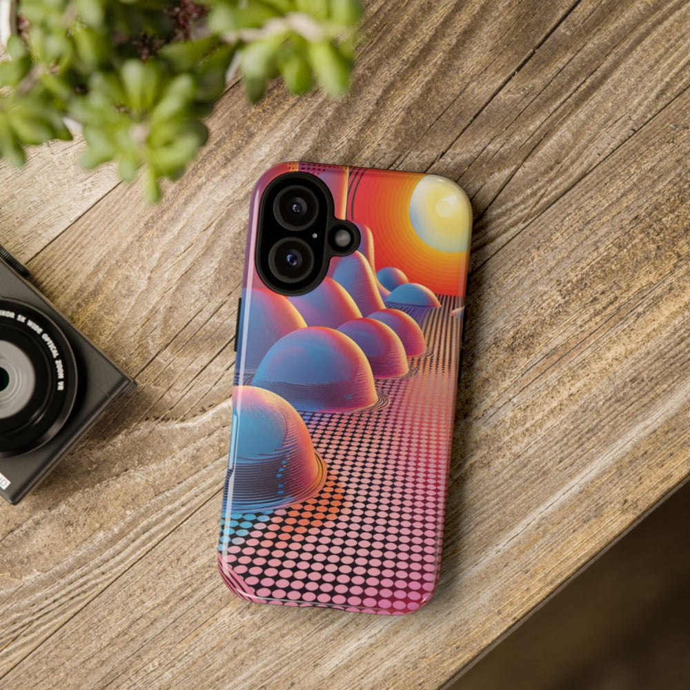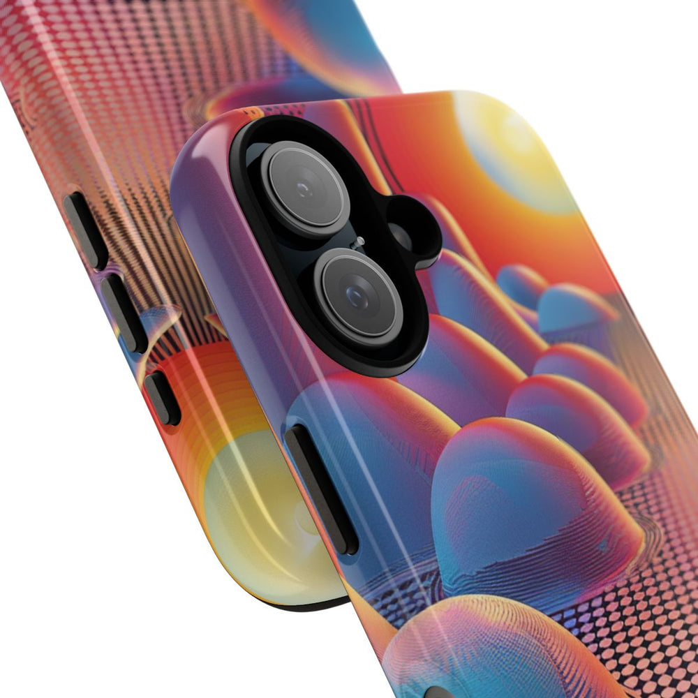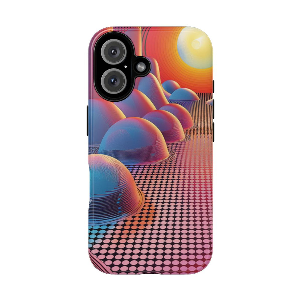 Dit hoesje heeft een abstract ontwerp met vloeiende, afgeronde blauwe vormen op een vloer met roze en zwarte stippen. Op de achtergrond straalt een grote zon met concentrische cirkels in warme tinten geel, oranje en rood. Verticale strepen en stippen in paars, rood en zwart omlijsten het geheel en zorgen voor een dynamisch en intrigerend optisch effect. Het hoesje bestaat uit twee lagen met een glanzende polycarbonaat buitenkant en een TPU-binnenzijde, en is geschikt voor draadloos opladen.