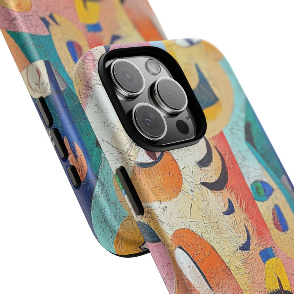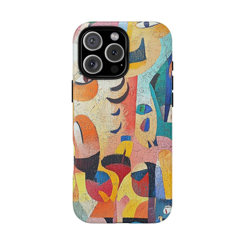 Dit hoesje heeft een abstract ontwerp met overlappende gezichten en vormen in levendige kleuren zoals blauw, oranje, roze, geel en groen. Het kunstwerk heeft een geschilderde uitstraling met zichtbare penseelstreken en een speelse verdeling van ogen, neuzen en monden over het geheel. Het matte hoesje bestaat uit twee lagen van polycarbonaat en TPU voor extra bescherming en ondersteunt draadloos opladen.