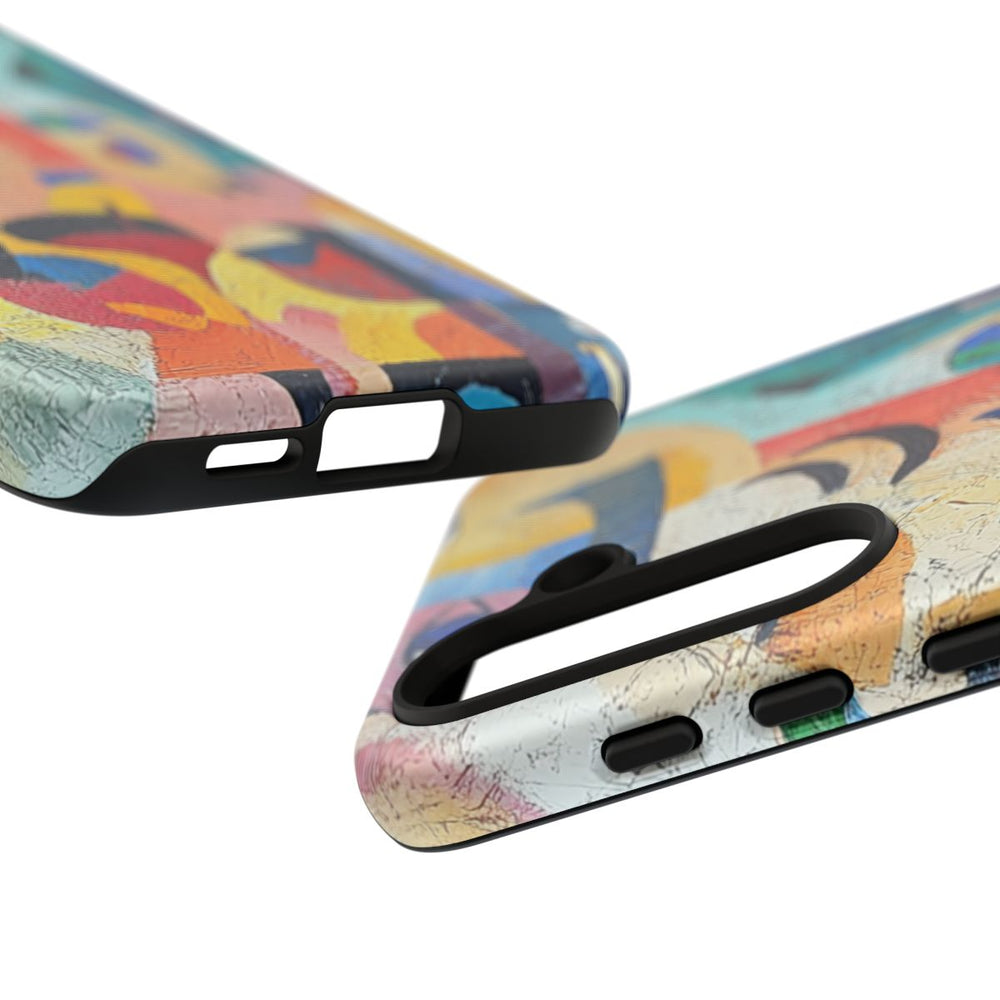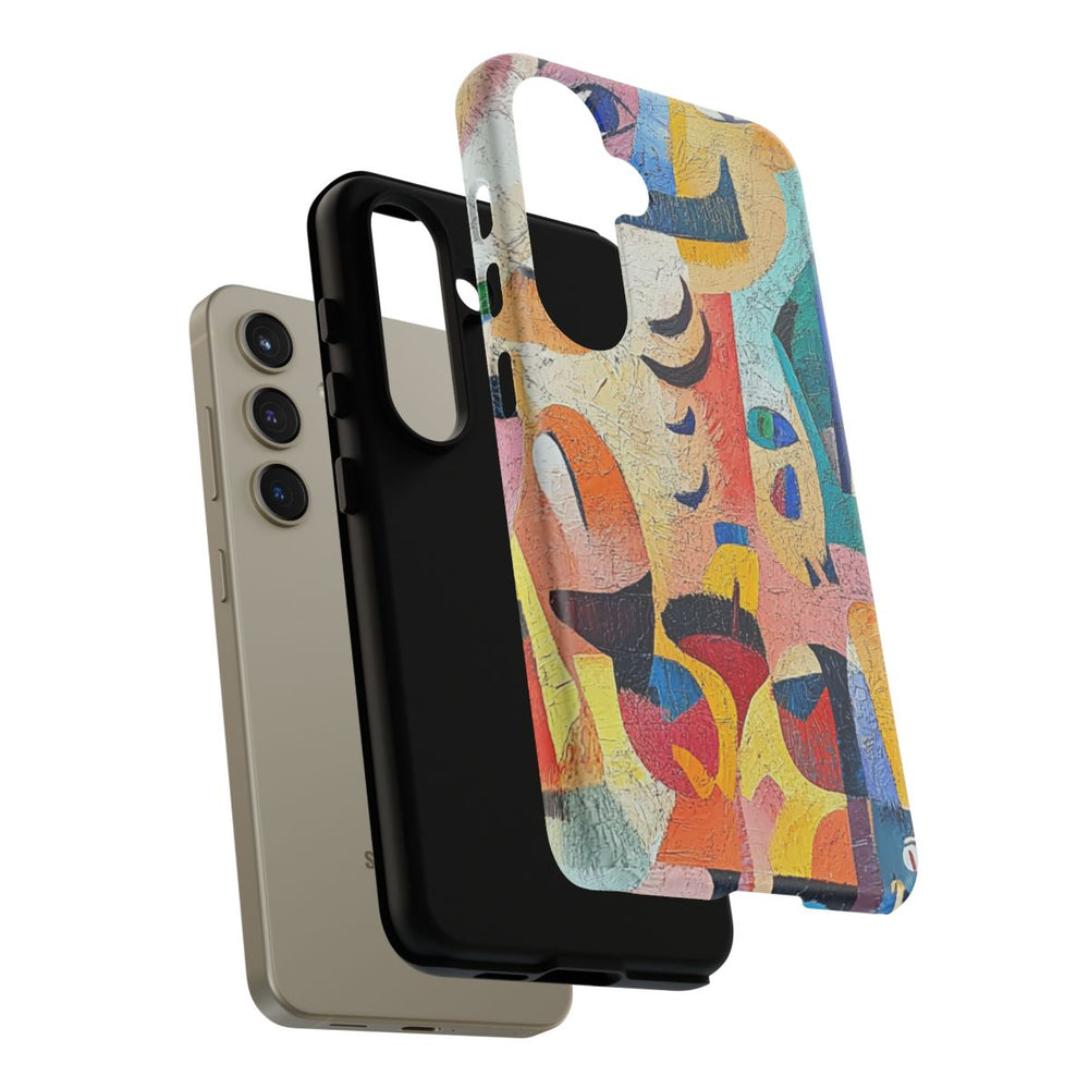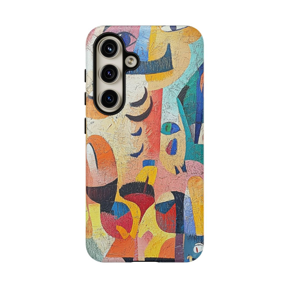 Dit ontwerp toont een abstracte compositie van overlappende gezichten en vormen, geschilderd met zichtbare penseelstreken. Het kunstwerk gebruikt een levendig kleurenpalet met onder andere blauw, oranje, geel, roze, groen en paars. Verspreid over het beeld zijn verschillende ogen, neuzen en monden te zien, wat zorgt voor een speels en dynamisch geheel. Het hoesje is opgebouwd uit twee lagen met een stevige polycarbonaat buitenkant en een TPU binnenzijde. Het ondersteunt draadloos opladen en is bestand tegen verschillende weersomstandigheden.