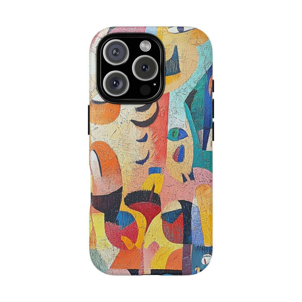 Dit hoesje heeft een abstract ontwerp met overlappende gezichten en vormen in levendige kleuren zoals blauw, oranje, geel, roze en groen. Het kunstwerk heeft een geschilderde uitstraling met zichtbare penseelstreken en een speelse, gefragmenteerde stijl. Het hoesje is stevig uitgevoerd met een dubbele laag van polycarbonaat en TPU, waardoor het extra bescherming biedt en geschikt is voor draadloos opladen.