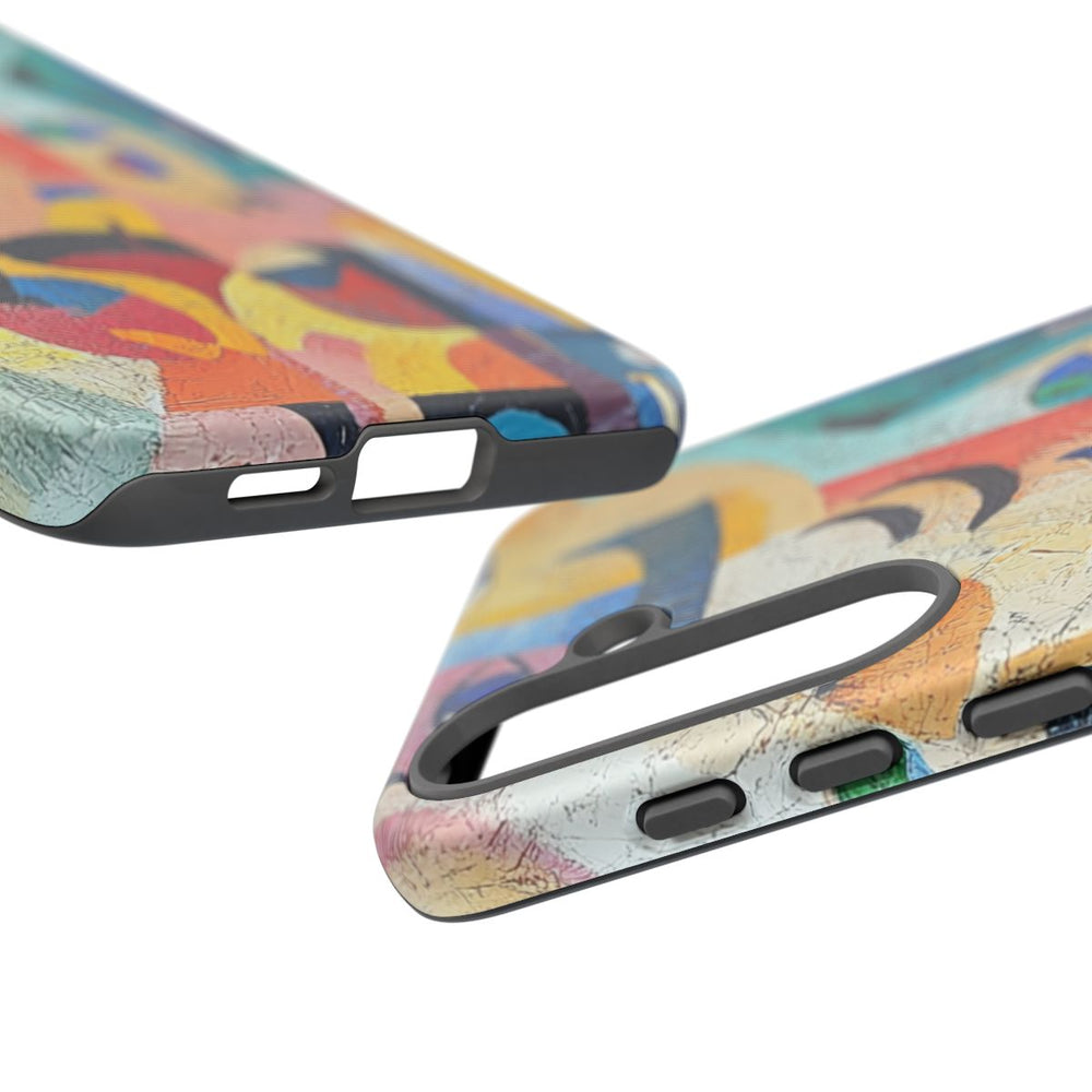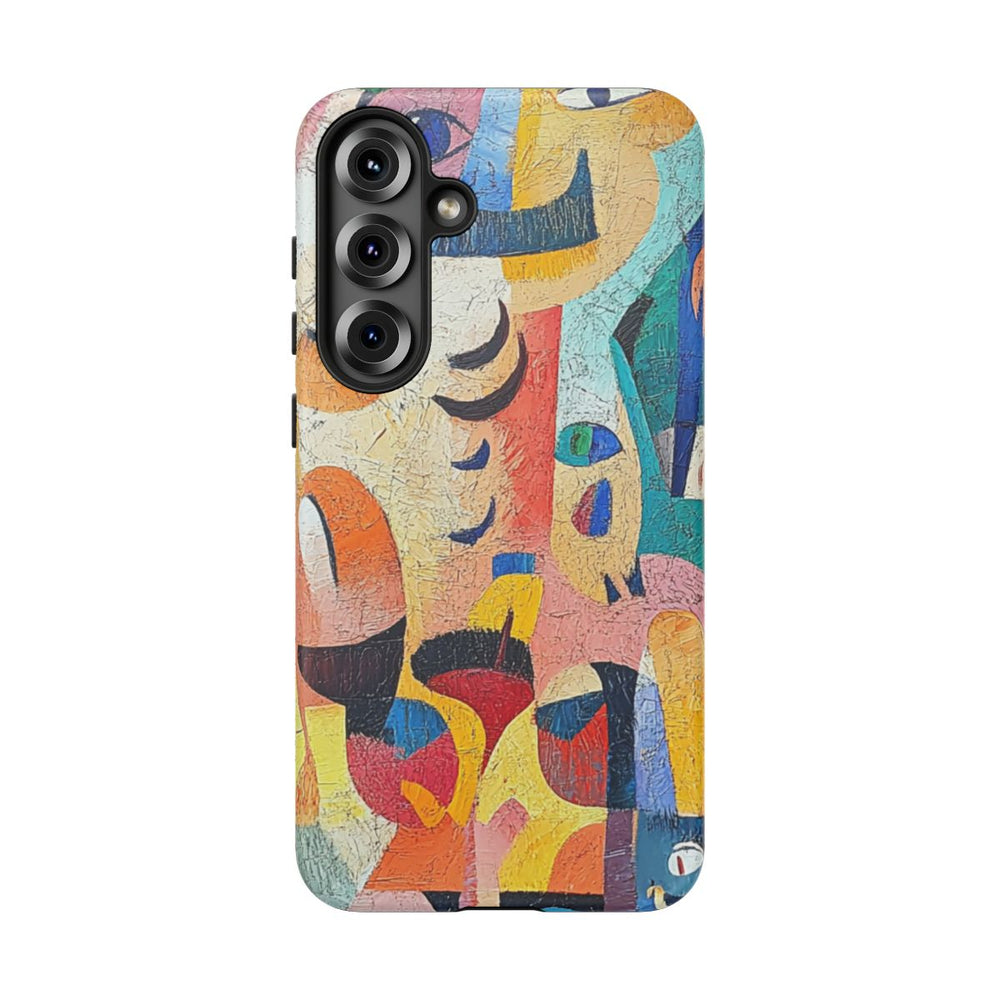 Dit hoesje heeft een abstract ontwerp met gezichten en vormen in een geschilderde, textuurrijke stijl. De afbeelding bestaat uit overlappende en in elkaar overlopende vormen in verschillende kleuren zoals blauw, oranje, geel, roze, groen en wit. Het hoesje is voorzien van een stevige polycarbonaat buitenkant en een TPU-binnenlaag voor dubbele bescherming. Geschikt voor draadloos opladen. De uitstraling is levendig en modern met een speelse, artistieke sfeer.