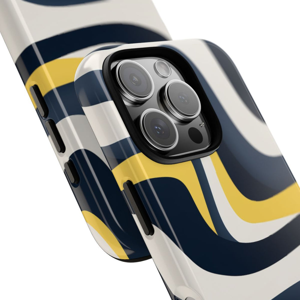 Dit hoesje heeft een abstract patroon van dikke, golvende lijnen in donkerblauw, felgeel en wit. De lijnen lopen vloeiend over het oppervlak en geven het hoesje een dynamische en moderne uitstraling. Het ontwerp is minimalistisch, maar opvallend, met brede zwarte contouren die het kleurcontrast versterken. De afbeelding is gedrukt op een mat hoesje met een stevige polycarbonaat buitenkant en een TPU binnenzijde, wat zorgt voor extra duurzaamheid en bescherming. Geschikt voor draadloos opladen.