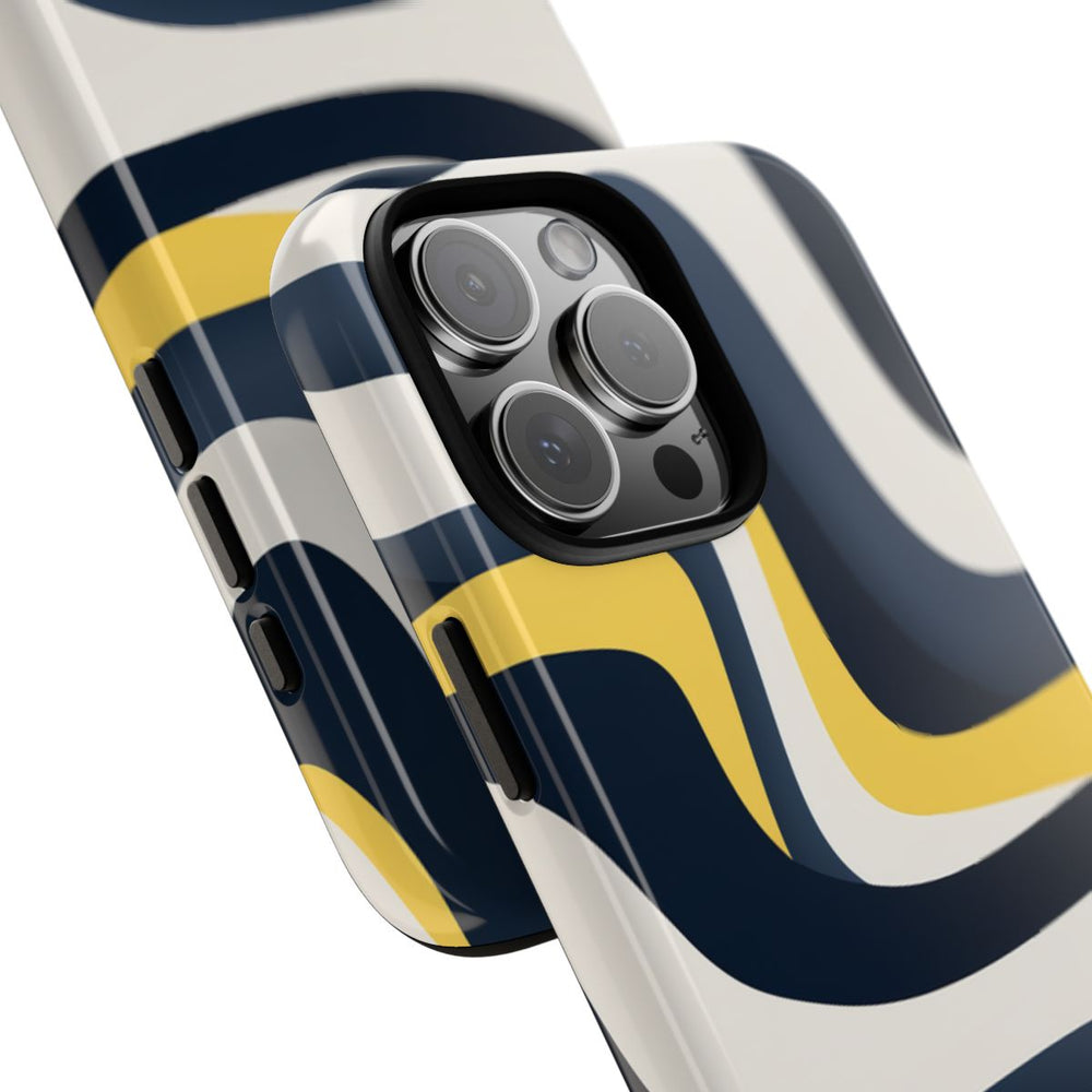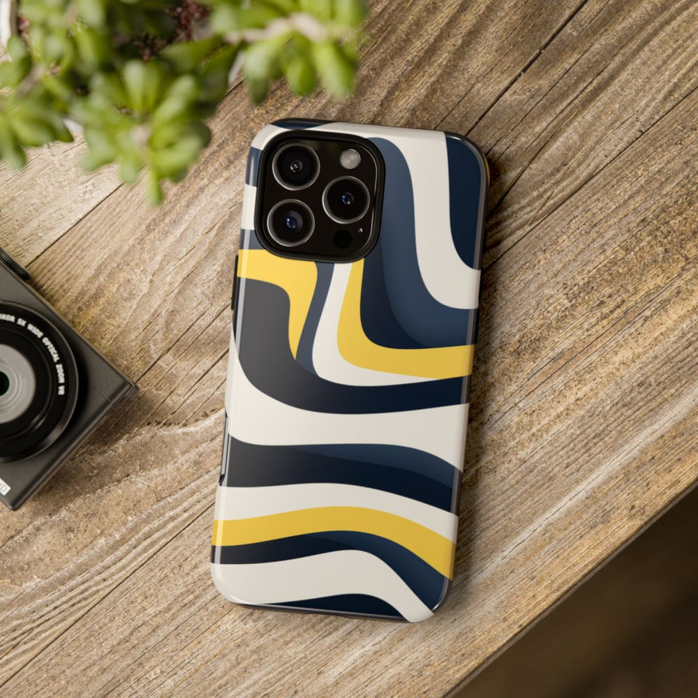 Dit hoesje heeft een abstract patroon van dikke, golvende lijnen in donkerblauw, felgeel en wit. De lijnen lopen vloeiend over het oppervlak en geven het hoesje een dynamische en moderne uitstraling. Het ontwerp is minimalistisch, maar opvallend, met brede zwarte contouren die het kleurcontrast versterken. De afbeelding is gedrukt op een mat hoesje met een stevige polycarbonaat buitenkant en een TPU binnenzijde, wat zorgt voor extra duurzaamheid en bescherming. Geschikt voor draadloos opladen.