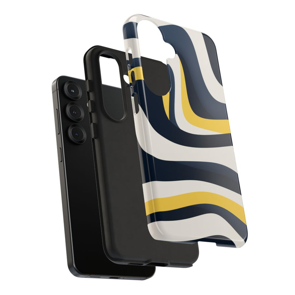 Dit hoesje heeft een abstract patroon van dikke, golvende lijnen in donkerblauw, felgeel en wit. De lijnen lopen vloeiend over het oppervlak en geven het hoesje een dynamische en moderne uitstraling. Het ontwerp is minimalistisch, maar opvallend, met brede zwarte contouren die het kleurcontrast versterken. De afbeelding is gedrukt op een mat hoesje met een stevige polycarbonaat buitenkant en een TPU binnenzijde, wat zorgt voor extra duurzaamheid en bescherming. Geschikt voor draadloos opladen.