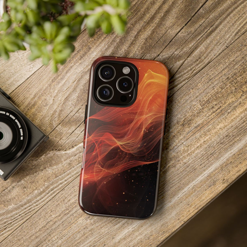 Dit ontwerp toont een abstracte compositie van golvende, doorschijnende lijnen in tinten oranje en rood. De lijnen hebben een verfijnde, zijdeachtige structuur met fijne details en subtiele kleurverlopen, wat zorgt voor een gevoel van beweging en diepte. Kleine, lichtgevende deeltjes zijn verspreid over de donkere achtergrond en versterken het dynamische en etherische effect. Het hoesje heeft een glanzende afwerking en bestaat uit een stevige polycarbonaat buitenkant met een TPU binnenzijde. Zo biedt het hoesje dubbele bescherming en is het geschikt voor draadloos opladen.