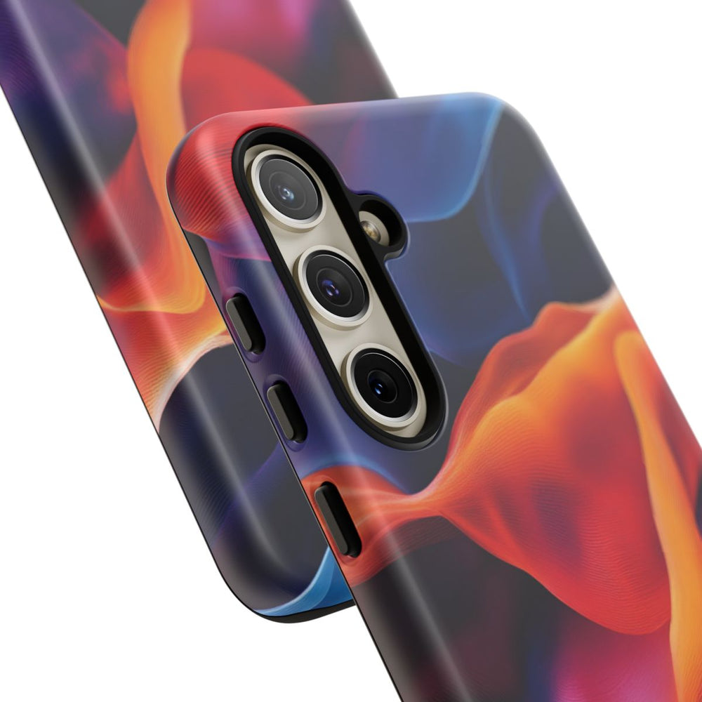Dit telefoonhoesje heeft een abstract ontwerp met golvende lijnen en vloeiende vormen in levendige tinten rood, oranje, paars en blauw. De gelaagde, golvende structuren zorgen voor een dynamisch en modern effect. Het matte hoesje is extra stevig dankzij de dubbele laag van een polycarbonaat buitenkant en een TPU binnenzijde, wat zorgt voor optimale bescherming. Het hoesje ondersteunt draadloos opladen en is bestand tegen invloeden van buitenaf.