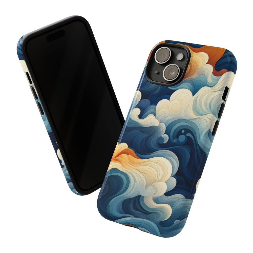 Dit hoesje is voorzien van een abstract patroon met vloeiende, golvende vormen in verschillende tinten blauw, crème en oranje. De golven hebben een gelaagde, draaiende structuur die zorgt voor een gevoel van beweging en diepte. Het patroon is glad en doorlopend, met gebogen lijnen die naadloos in elkaar overlopen. Het hoesje heeft een glanzende afwerking en bestaat uit een stevige dubbele laag van een polycarbonaat buitenkant en een TPU-binnenzijde, voor extra stevigheid en bescherming. Ondersteunt draadloos opladen en is bestand tegen invloeden van buitenaf.
