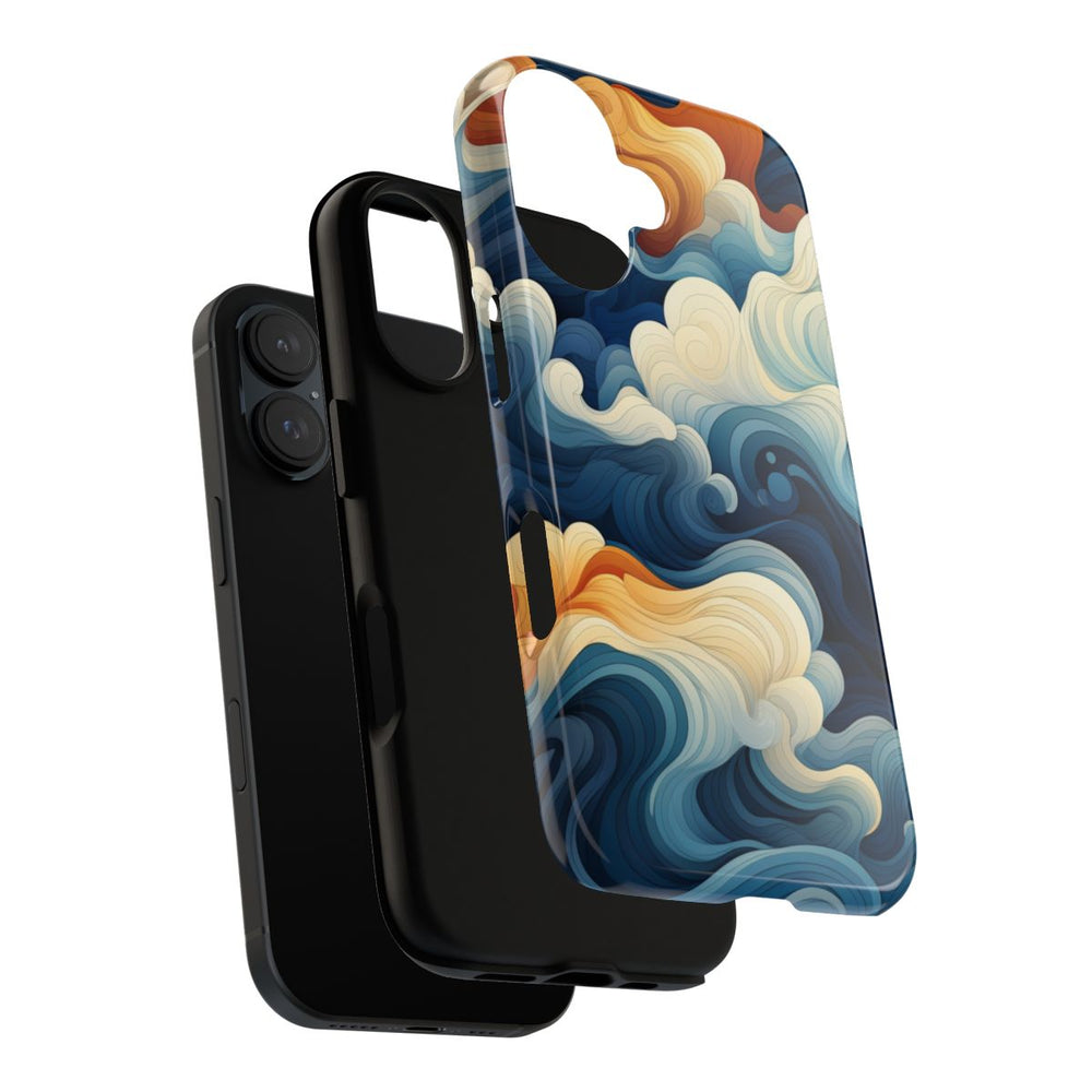 Dit hoesje is voorzien van een abstract patroon met vloeiende, golvende vormen in verschillende tinten blauw, crème en oranje. De golven hebben een gelaagde, draaiende structuur die zorgt voor een gevoel van beweging en diepte. Het patroon is glad en doorlopend, met gebogen lijnen die naadloos in elkaar overlopen. Het hoesje heeft een glanzende afwerking en bestaat uit een stevige dubbele laag van een polycarbonaat buitenkant en een TPU-binnenzijde, voor extra stevigheid en bescherming. Ondersteunt draadloos opladen en is bestand tegen invloeden van buitenaf.