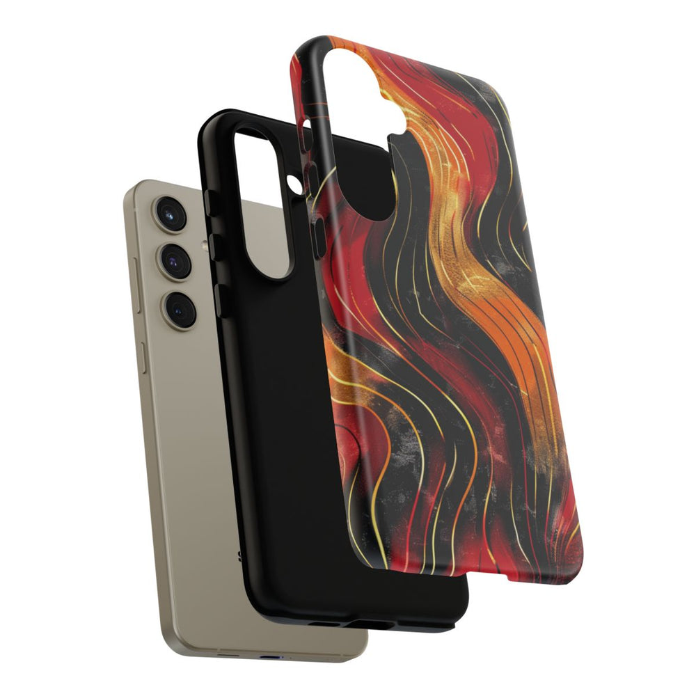Dit hoesje heeft een abstract patroon met vloeiende, golvende lijnen in tinten rood, oranje en goud op een zwarte achtergrond. Het ontwerp bestaat uit herhalende, soepele bochten en subtiele textuurdetails, wat zorgt voor een dynamisch en levendig effect. Het hoesje is opgebouwd uit twee lagen: een stevige polycarbonaat buitenkant en een TPU binnenkant voor extra stevigheid en bescherming. Geschikt voor draadloos opladen en bestand tegen weersinvloeden, terwijl de optische kwaliteit behouden blijft.