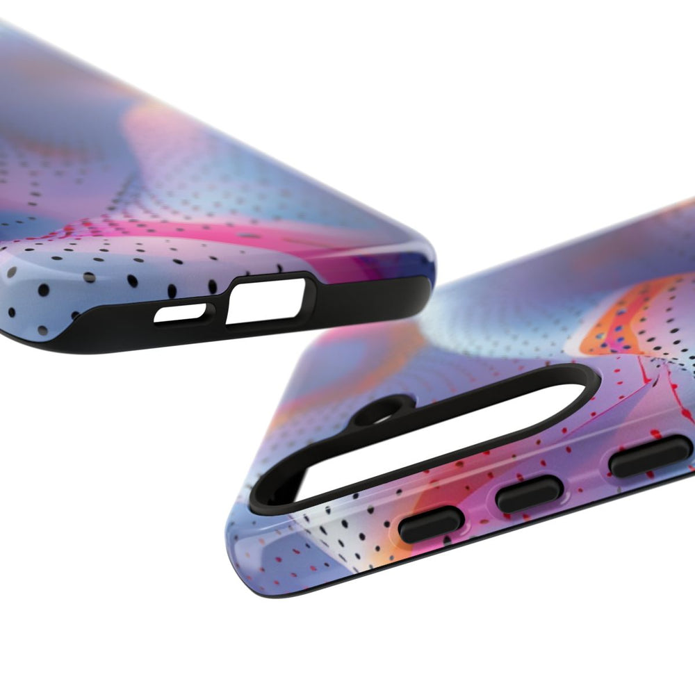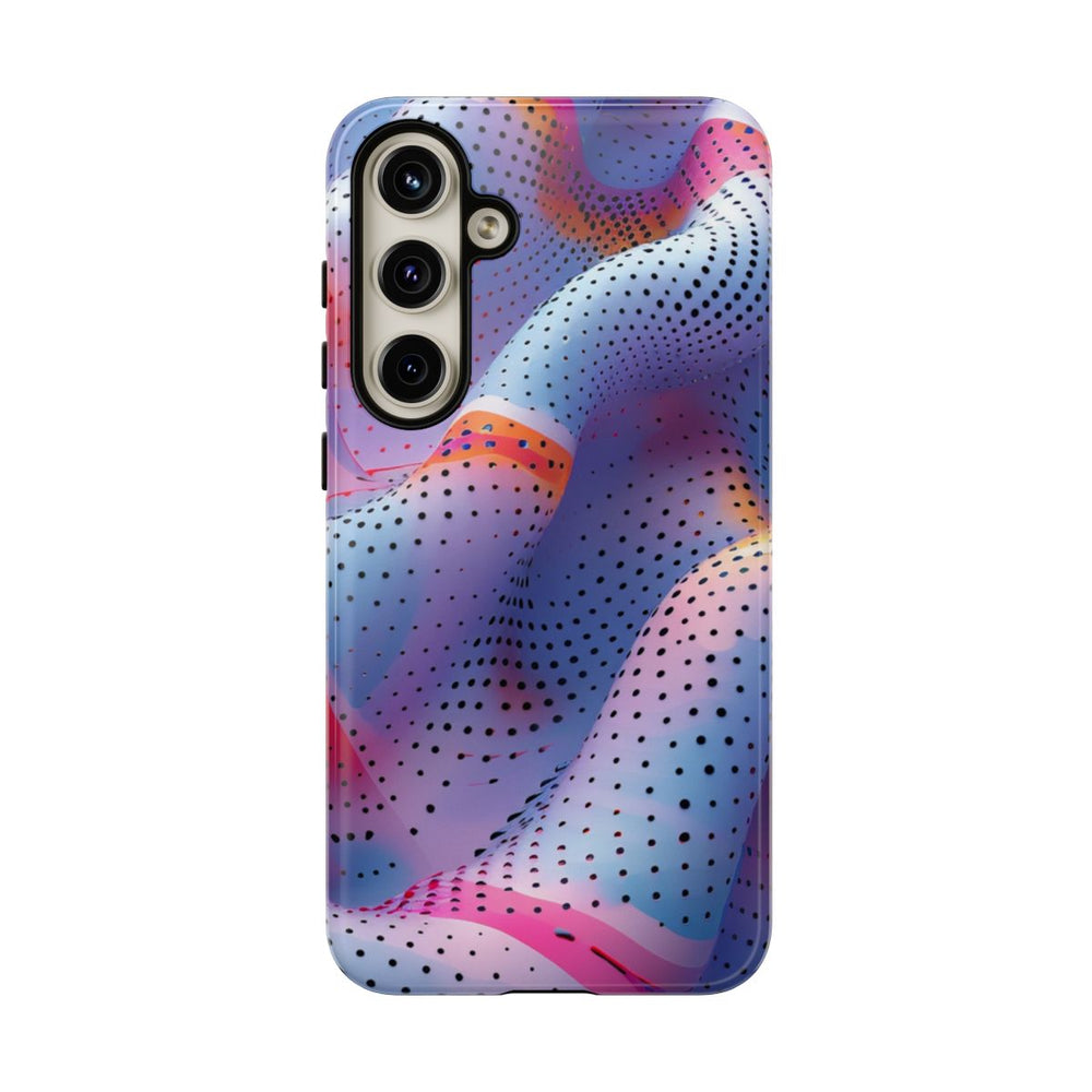 Dit ontwerp toont een abstracte, golvende ondergrond met een patroon van kleine zwarte stippen. De achtergrondkleuren lopen vloeiend in elkaar over met tinten lichtblauw, roze, paars en oranje, wat zorgt voor een dynamische en levendige uitstraling. De stippen verschillen in dichtheid en grootte, waardoor diepte en beweging worden benadrukt. De afbeelding is gedrukt op een glanzend en stevig hoesje van duurzaam polycarbonaat en TPU, dat bestaat uit twee lagen voor extra bescherming en geschikt is voor draadloos opladen.