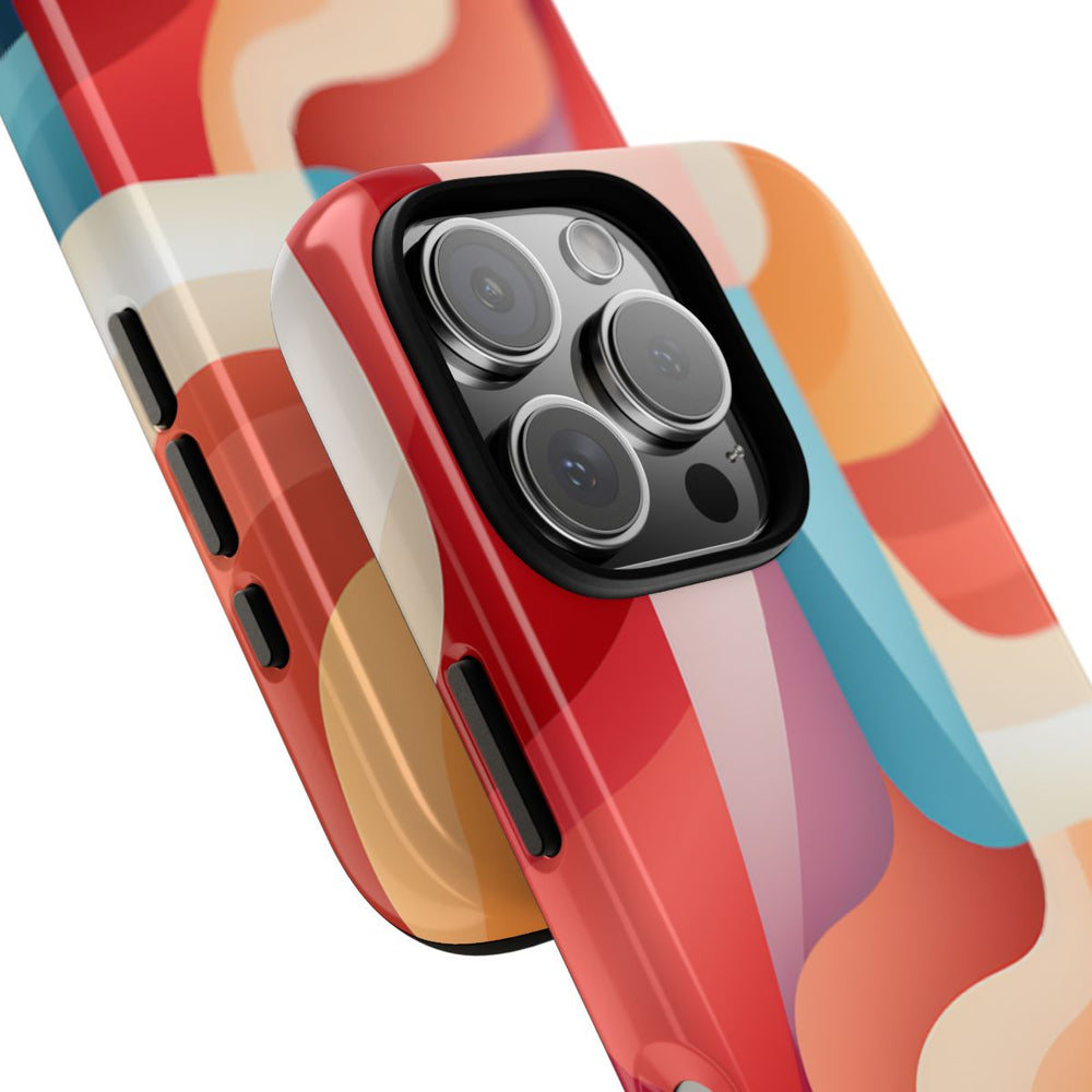 Dit hoesje heeft een abstract patroon van vloeiende, gebogen vormen die in lagen over elkaar heen zijn gelegd en met elkaar verweven zijn in een levendig kleurenpalet. De hoofdkleuren zijn koraal, rood, oranje, beige en blauw, wat zorgt voor een dynamische en sierlijke uitstraling. De vormen hebben een subtiel verloop, waardoor diepte en beweging ontstaan. Het hoesje heeft een glanzende afwerking, is extra stevig en bestaat uit een 100% polycarbonaat buitenkant met een 100% TPU binnenzijde. Ontworpen voor optimale bescherming en geschikt voor draadloos opladen.