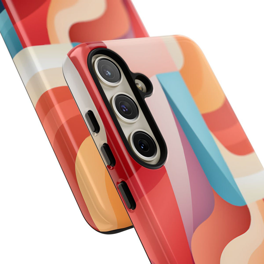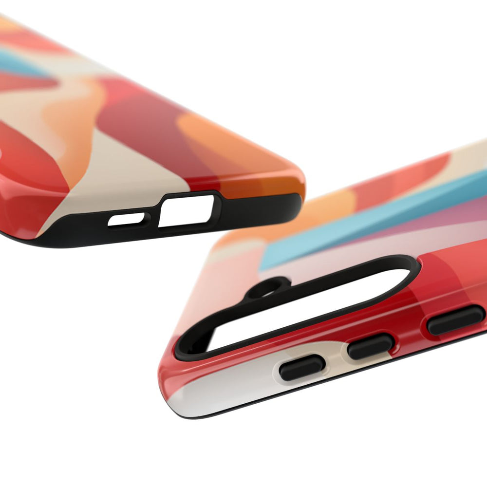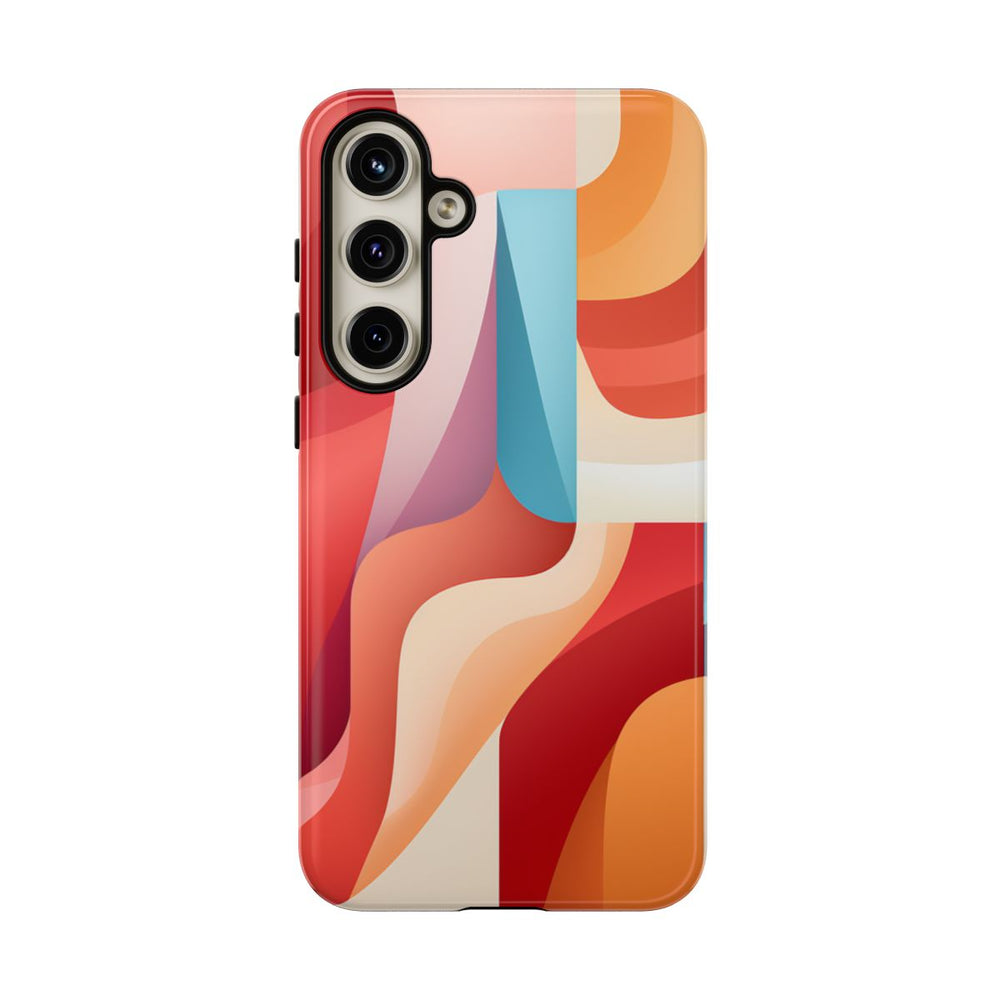 Dit hoesje heeft een abstract patroon van vloeiende, gebogen vormen die in lagen over elkaar heen zijn gelegd en met elkaar verweven zijn in een levendig kleurenpalet. De hoofdkleuren zijn koraal, rood, oranje, beige en blauw, wat zorgt voor een dynamische en sierlijke uitstraling. De vormen hebben een subtiel verloop, waardoor diepte en beweging ontstaan. Het hoesje heeft een glanzende afwerking, is extra stevig en bestaat uit een 100% polycarbonaat buitenkant met een 100% TPU binnenzijde. Ontworpen voor optimale bescherming en geschikt voor draadloos opladen.