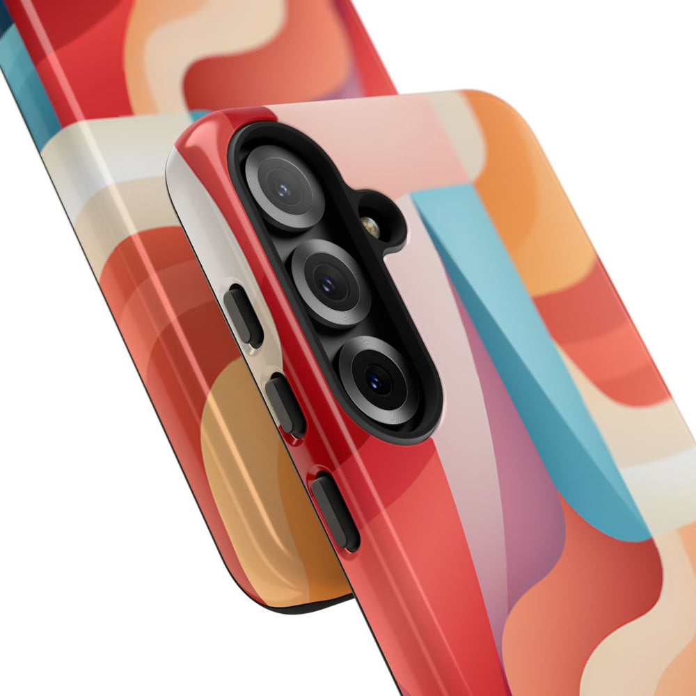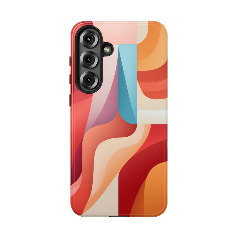 Dit hoesje heeft een abstract patroon van vloeiende, gebogen vormen die in lagen over elkaar heen zijn gelegd en met elkaar verweven zijn in een levendig kleurenpalet. De hoofdkleuren zijn koraal, rood, oranje, beige en blauw, wat zorgt voor een dynamische en sierlijke uitstraling. De vormen hebben een subtiel verloop, waardoor diepte en beweging ontstaan. Het hoesje heeft een glanzende afwerking, is extra stevig en bestaat uit een 100% polycarbonaat buitenkant met een 100% TPU binnenzijde. Ontworpen voor optimale bescherming en geschikt voor draadloos opladen.