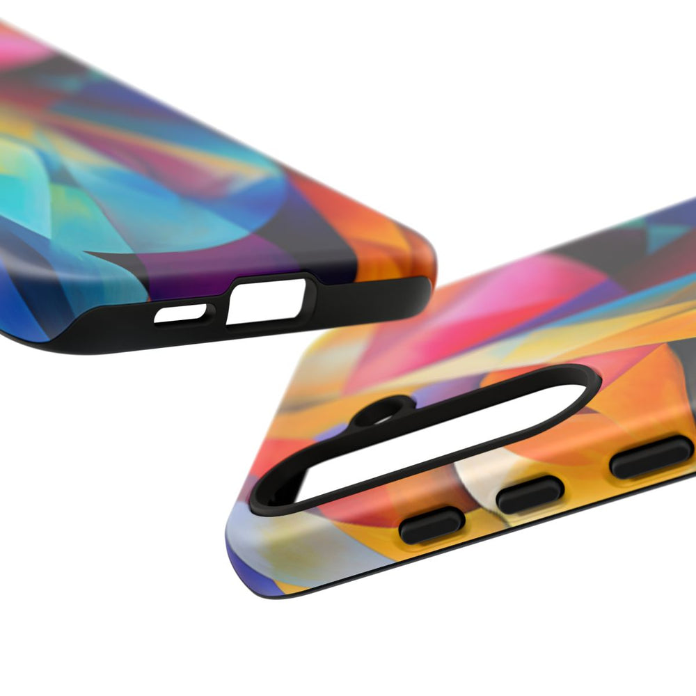 Dit telefoonhoesje is voorzien van een abstract ontwerp met levendige geometrische vormen en een rijk kleurenpalet. Het kunstwerk combineert scherpe lijnen met vloeiende vormen, wat zorgt voor een gevoel van beweging en energie. De kleuren variëren van diepe blauwtinten en heldergeel tot opvallend rood en roze, wat het hoesje een krachtige uitstraling geeft. Dankzij de dubbele laag biedt het hoesje extra bescherming en is het geschikt voor draadloos opladen, waardoor het een praktische keuze is voor dagelijks gebruik.