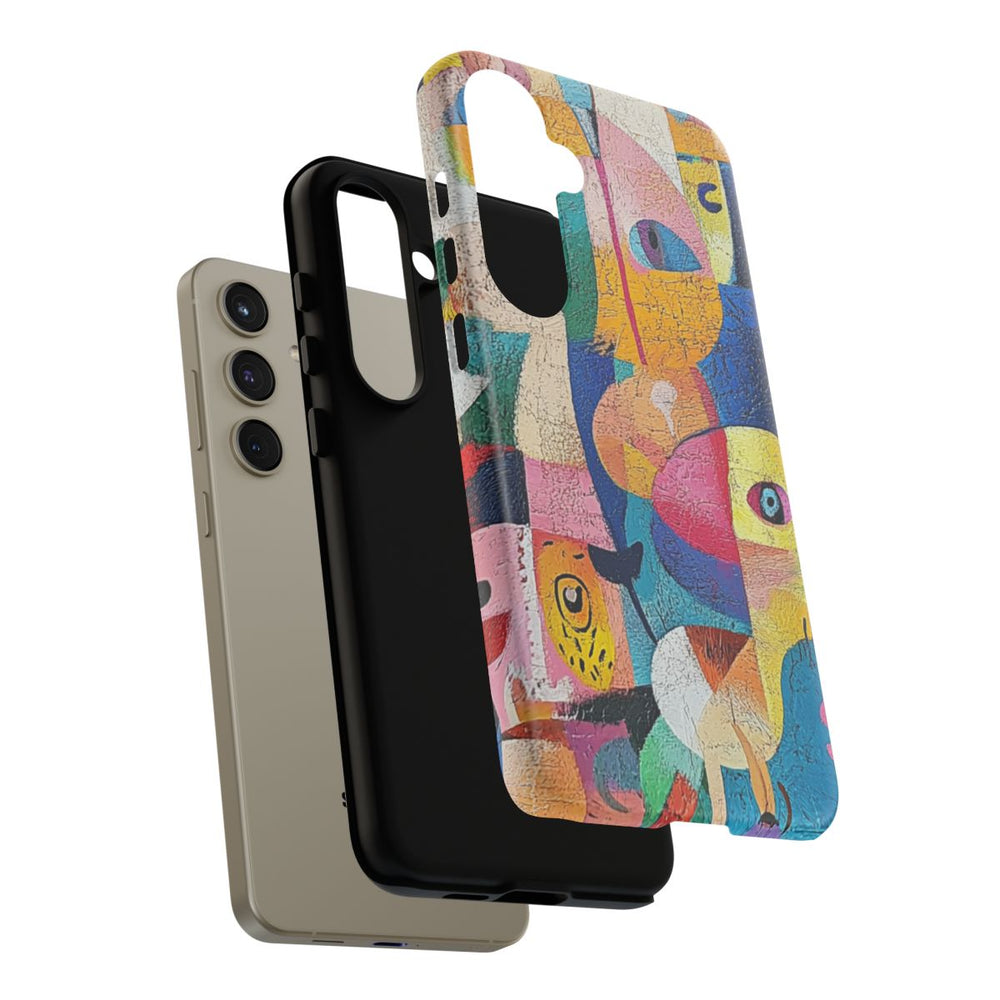 Dit hoesje heeft een abstract ontwerp met kleurrijke gezichten en vormen in een bijzondere textuur. Het beeld bestaat uit heldere tinten zoals geel, roze, blauw, groen en oranje, die samenkomen in overlappende geometrische en organische patronen. De afbeelding heeft een gebarsten verf-effect, wat extra diepte en karakter geeft. Het hoesje bestaat uit twee lagen van polycarbonaat en TPU, heeft een matte afwerking, is geschikt voor draadloos opladen en sluit perfect aan op het genoemde telefoonmodel.