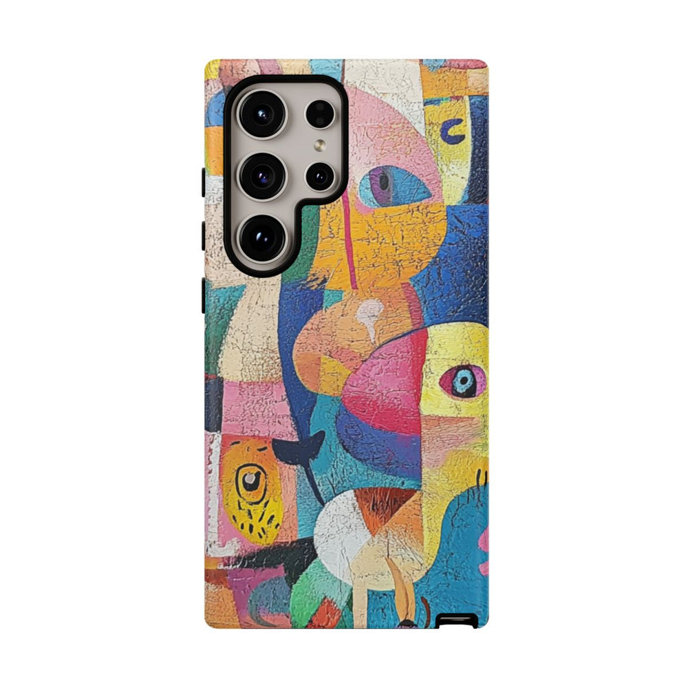 Dit hoesje heeft een abstract ontwerp met kleurrijke, overlappende vormen en gezichten, afgewerkt met een getextureerd, gebarsten verfeffect. De levendige kleurencombinatie bestaat uit onder andere blauw, roze, geel, groen en oranje. Het stevige, matte hoesje bestaat uit twee lagen van polycarbonaat en TPU, wat zorgt voor duurzaamheid en bescherming, ook buitenshuis. Daarnaast ondersteunt het hoesje draadloos opladen. De abstracte stijl zorgt voor een speels en dynamisch uiterlijk.
