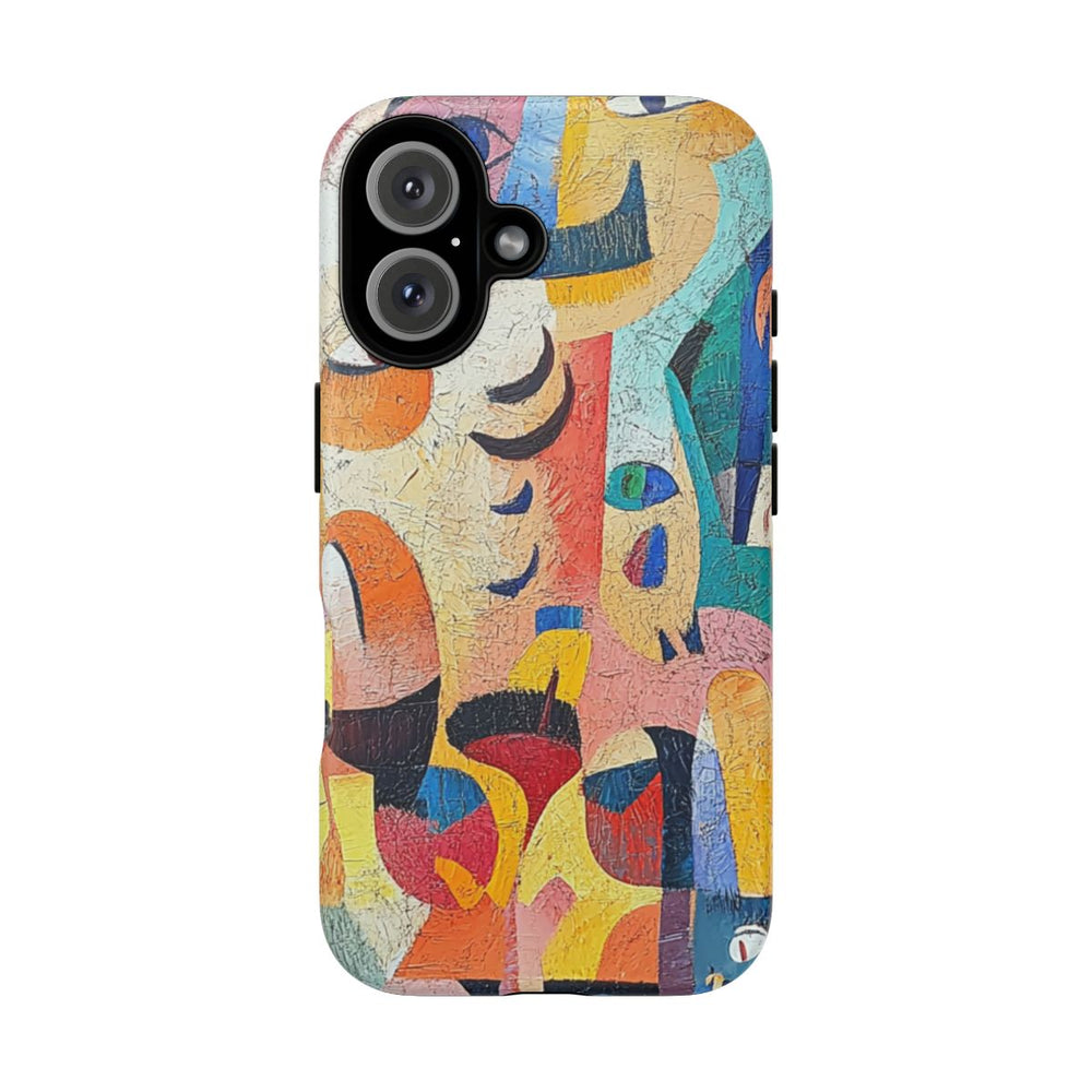 Dit telefoonhoesje is bedrukt met een abstract kunstwerk van diverse gestileerde gezichten en vormen in een levendige mix van kleuren zoals blauw, oranje, geel, roze en groen. De schilderachtige textuur geeft het ontwerp extra diepte en karakter. Het hoesje heeft een matte afwerking en bestaat uit een stevige polycarbonaat buitenkant met een TPU binnenzijde voor optimale bescherming. Bovendien ondersteunt het hoesje draadloos opladen.
