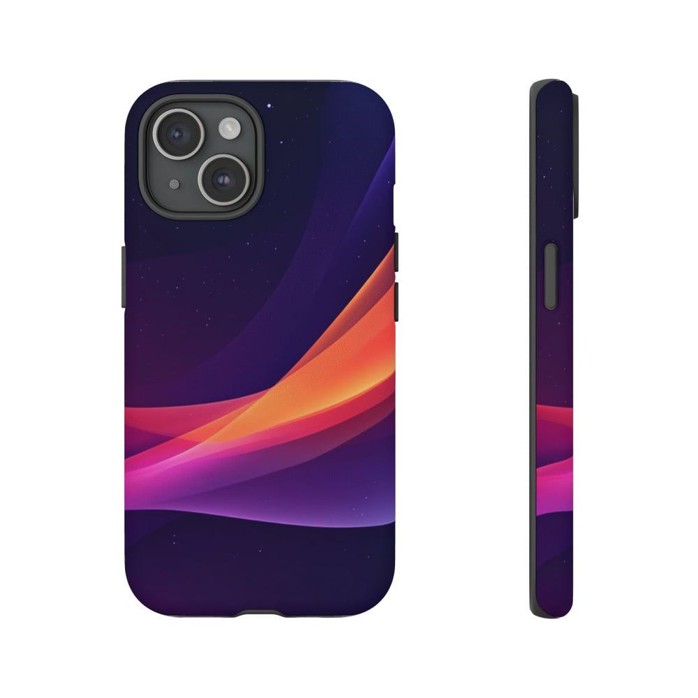 Dit hoesje heeft een ontwerp met vloeiende, doorschijnende golven in roze, oranje en paarse tinten op een donkere, sterrenachtige achtergrond. De golven overlappen elkaar subtiel, wat zorgt voor een gevoel van beweging en diepte. Het hoesje bestaat uit twee lagen van polycarbonaat en TPU en biedt extra stevigheid en bescherming. Geschikt voor draadloos opladen. MagSafe wordt niet ondersteund.