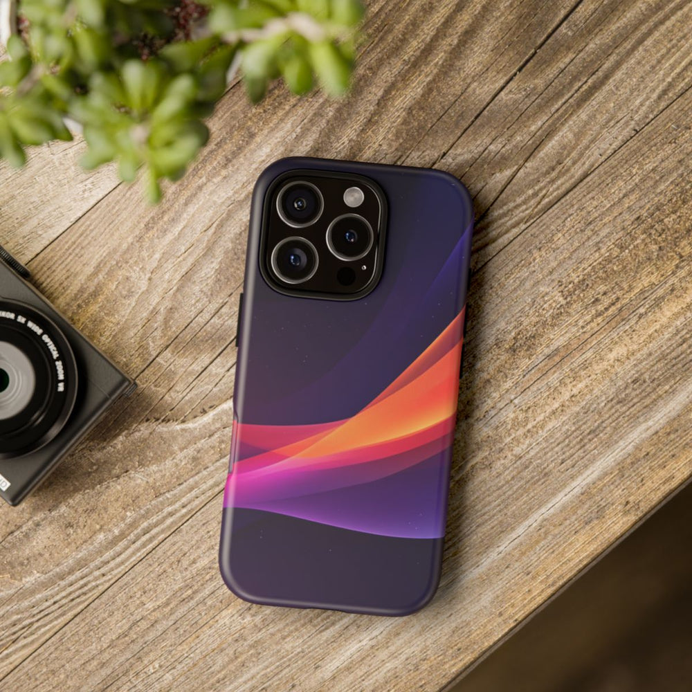 Dit hoesje heeft een opvallend ontwerp met vloeiende, doorzichtige golven in paars, roze, oranje en rood, tegen een donkere achtergrond met een sterrenhemel. De golven overlappen elkaar subtiel en zorgen zo voor diepte en dynamiek in het geheel. Het stevige hoesje bestaat uit twee lagen van polycarbonaat en TPU, waardoor je telefoon extra goed beschermd is tegen stoten en krassen. Geschikt voor draadloos opladen. Let op: MagSafe wordt niet ondersteund.