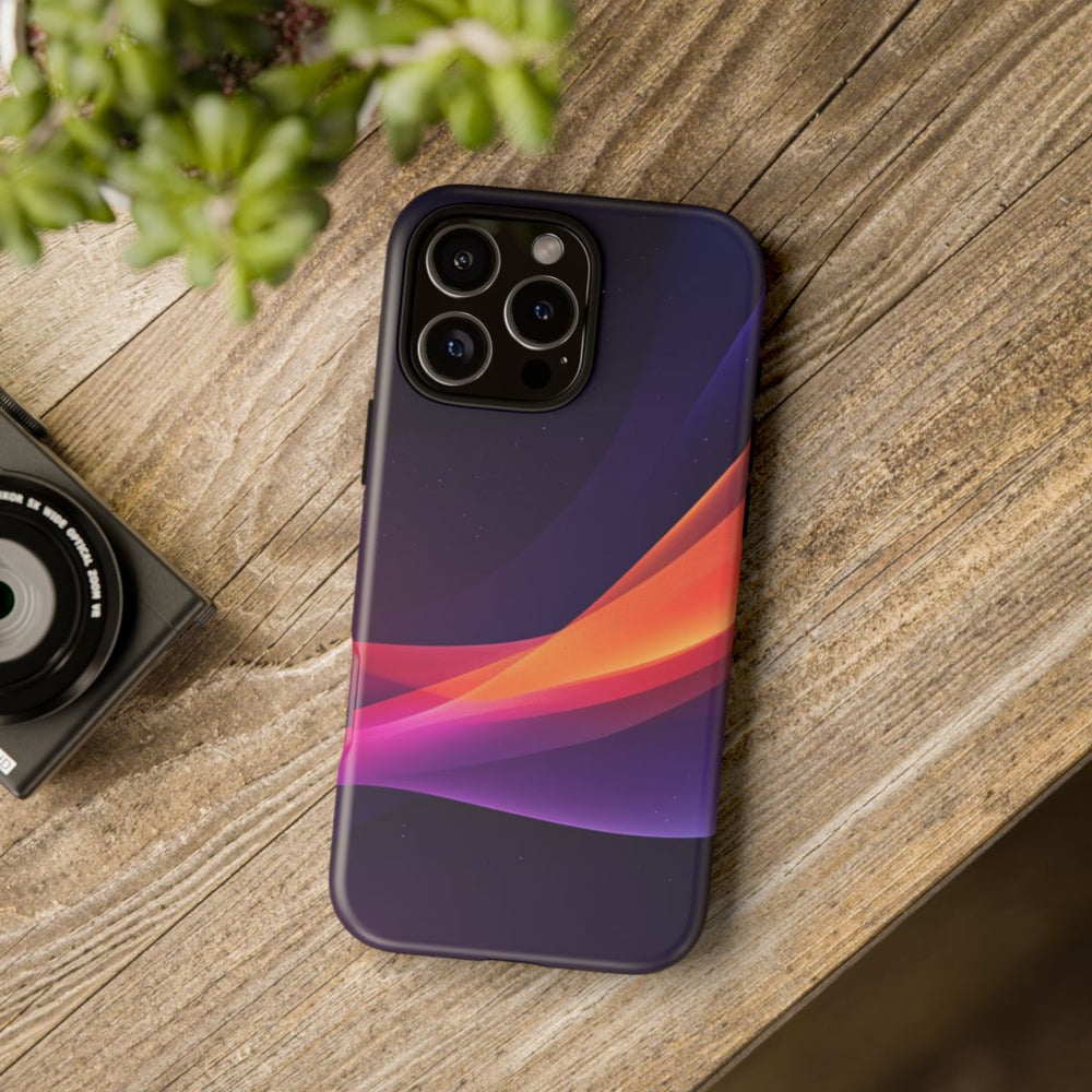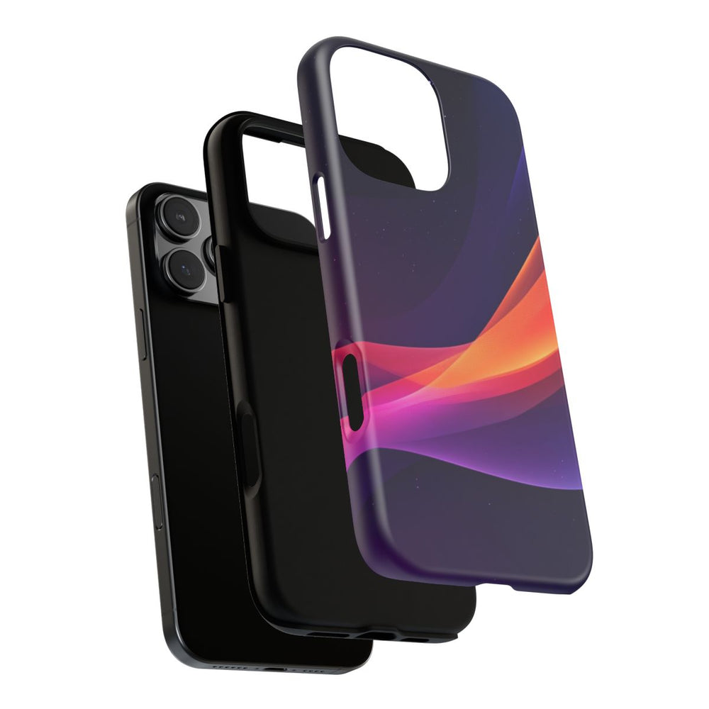 Dit ontwerp toont sierlijke, golvende lijnen in levendige kleuren zoals roze, oranje en paars, geplaatst op een achtergrond met een donkerblauw tot zwarte kleurverloop. Kleine witte stipjes verspreid over het geheel doen denken aan sterren en geven het hoesje een kosmische uitstraling. Het hoesje bestaat uit twee lagen: een stevige polycarbonaat buitenkant en een TPU binnenzijde. Hierdoor is het extra duurzaam en geschikt voor draadloos opladen.