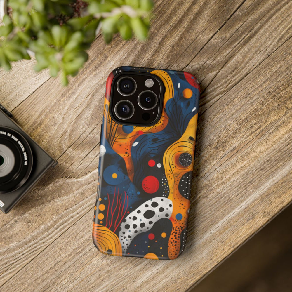 Dit telefoonhoesje heeft een abstract ontwerp met organische vormen en vloeiende lijnen in levendige kleuren zoals geel, rood, blauw, zwart en wit. Het patroon bevat verschillende cirkelvormige en gestippelde elementen die zorgen voor een dynamisch en opvallend geheel. Het hoesje bestaat uit twee lagen: een stevige buitenkant van polycarbonaat en een TPU-binnenkant, wat extra stevigheid en bescherming biedt. Geschikt voor draadloos opladen.