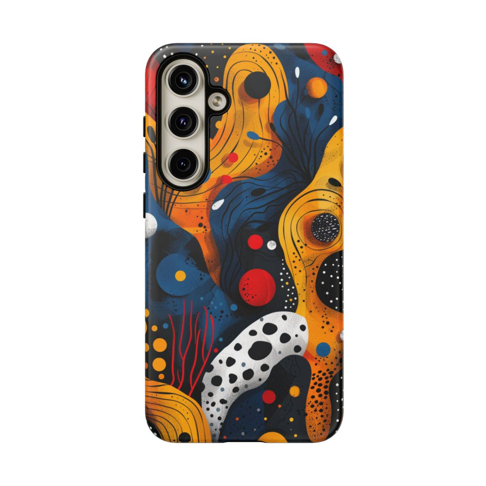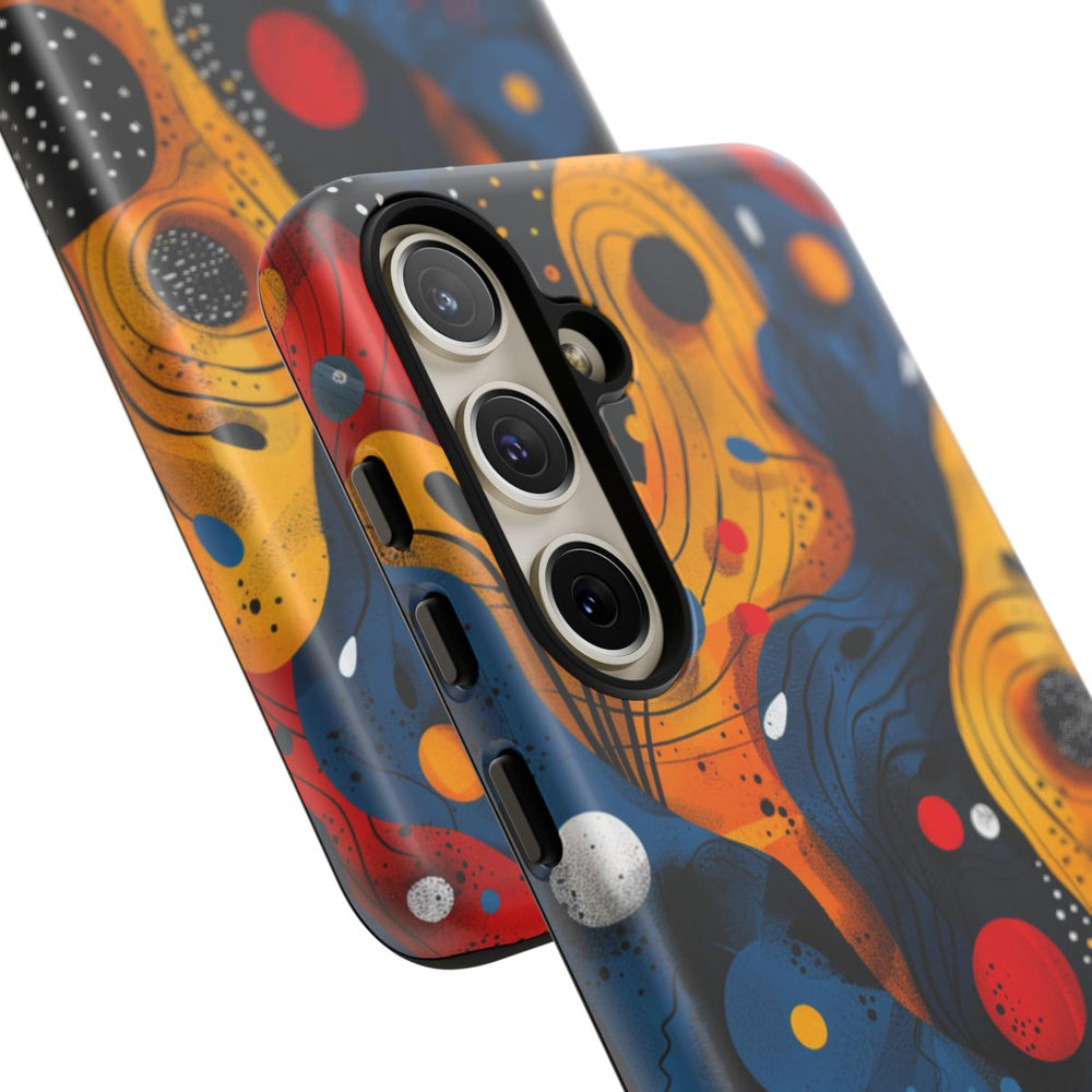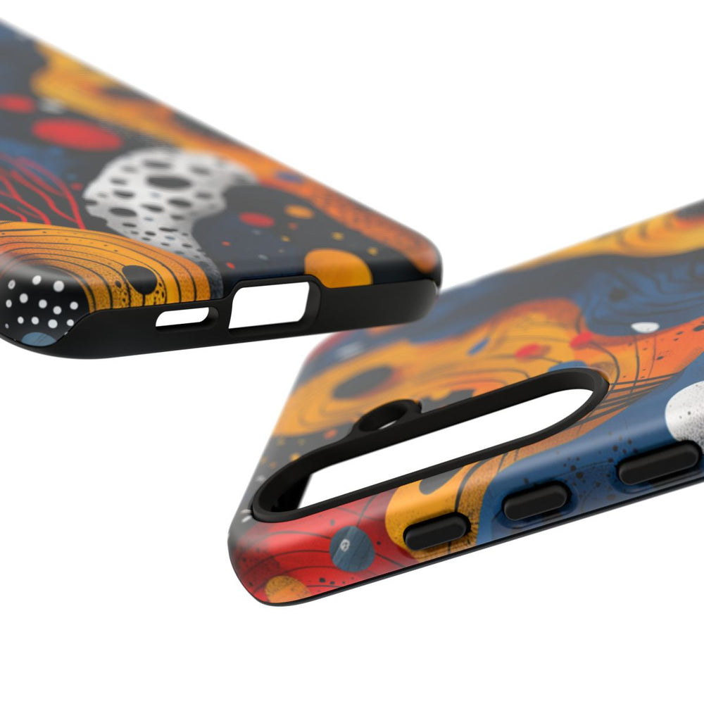 Dit telefoonhoesje heeft een abstract ontwerp met organische vormen en vloeiende lijnen in levendige kleuren zoals geel, rood, blauw, zwart en wit. Het patroon bevat verschillende cirkelvormige en gestippelde elementen die zorgen voor een dynamisch en opvallend geheel. Het hoesje bestaat uit twee lagen: een stevige buitenkant van polycarbonaat en een TPU-binnenkant, wat extra stevigheid en bescherming biedt. Geschikt voor draadloos opladen.