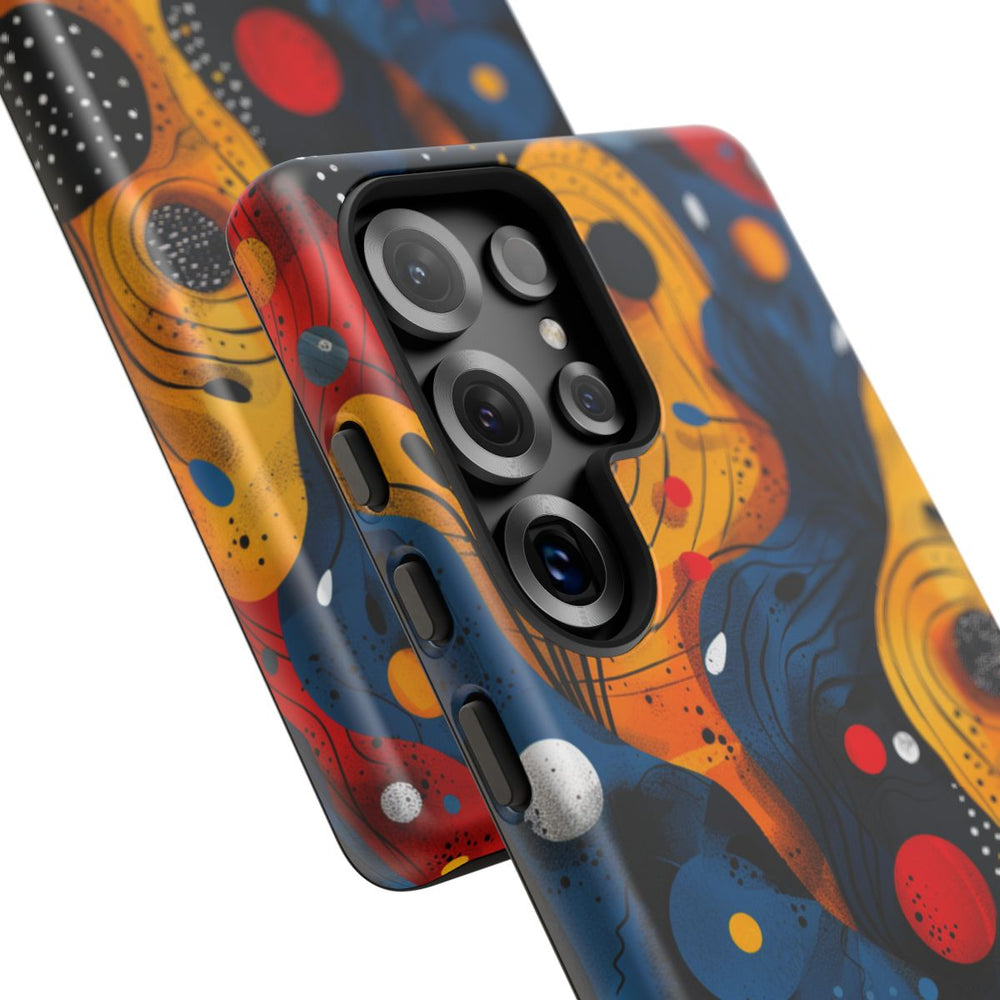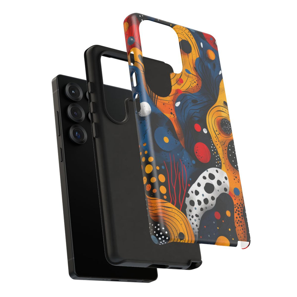 Dit telefoonhoesje heeft een abstract ontwerp met organische vormen en vloeiende lijnen in levendige kleuren zoals geel, rood, blauw, zwart en wit. Het patroon bevat verschillende cirkelvormige en gestippelde elementen die zorgen voor een dynamisch en opvallend geheel. Het hoesje bestaat uit twee lagen: een stevige buitenkant van polycarbonaat en een TPU-binnenkant, wat extra stevigheid en bescherming biedt. Geschikt voor draadloos opladen.