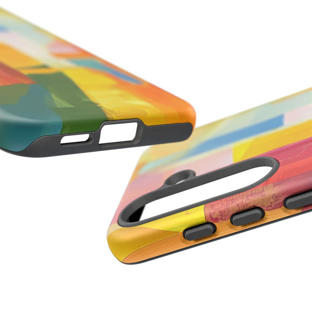 Dit hoesje heeft een abstract ontwerp met opvallende, kleurrijke penseelstreken in verticale en horizontale vlakken. Het kleurenpalet bestaat uit warme tinten zoals geel, oranje, rood en roze, gecombineerd met koele blauwen en groenen. De penseelstreken verschillen in textuur en dekking, wat zorgt voor een levendig en dynamisch geheel. Het hoesje is gemaakt van een stevige dubbele laag met een polycarbonaat buitenkant en een TPU-binnenzijde. Geschikt voor draadloos opladen en bestand tegen invloeden van buitenaf.