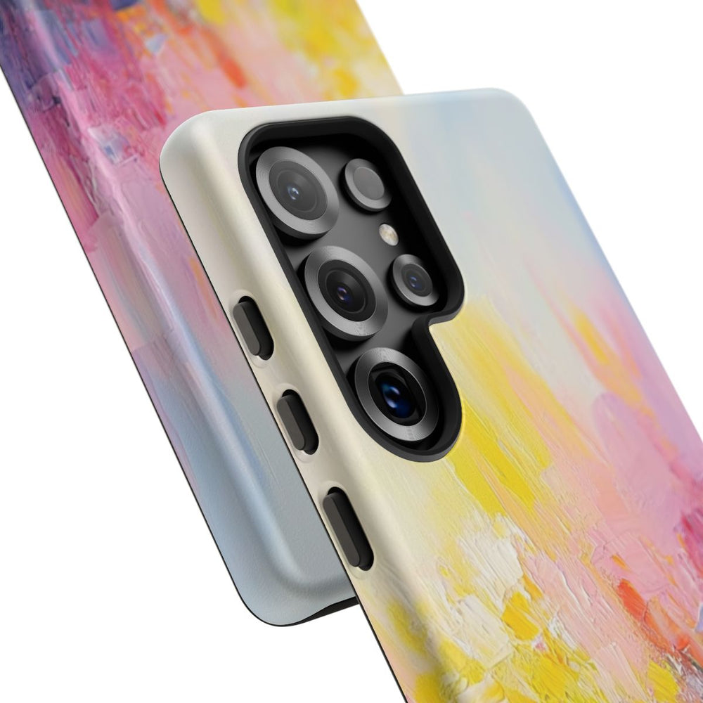 Dit hoesje heeft een abstract ontwerp met levendige penseelstreken in heldere tinten geel, roze, paars, blauw en groen. De kleuren lopen vloeiend in elkaar over van licht naar donker, wat zorgt voor een dynamisch en energiek effect. De textuur van de penseelstreken is duidelijk zichtbaar en geeft het geheel extra diepte en beweging. Het hoesje is vervaardigd uit een dubbele laag polycarbonaat met een TPU-binnenzijde, ondersteunt draadloos opladen en is bestand tegen verschillende weersomstandigheden.