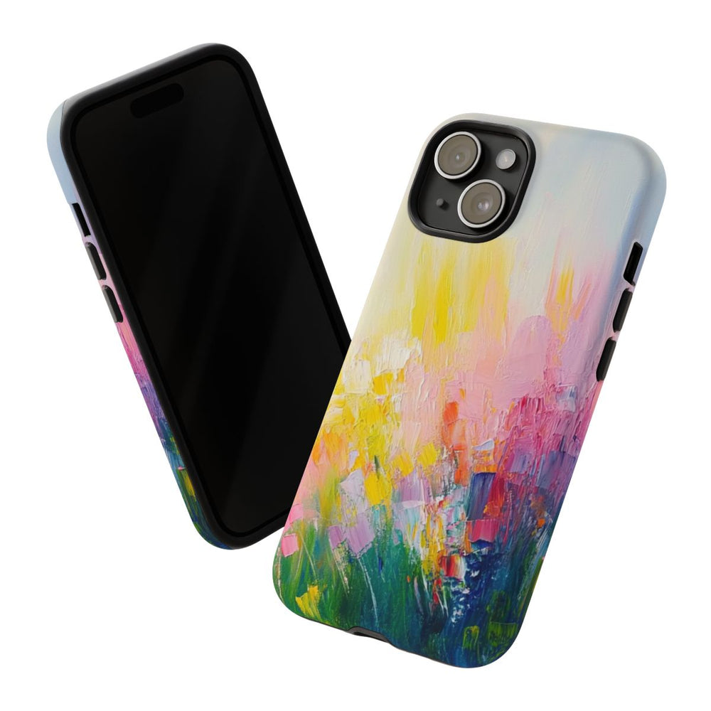 Dit hoesje heeft een opvallend ontwerp met abstracte verfstreken in heldere tinten geel, roze, paars, blauw en groen. De getextureerde penseelstreken zorgen voor een dynamische en levendige uitstraling die energiek en artistiek oogt. Het hoesje bestaat uit twee lagen: een stevige polycarbonaat buitenkant en een TPU binnenzijde voor extra bescherming en duurzaamheid. Daarnaast ondersteunt het hoesje draadloos opladen. Het geheel is kleurrijk en expressief vormgegeven.