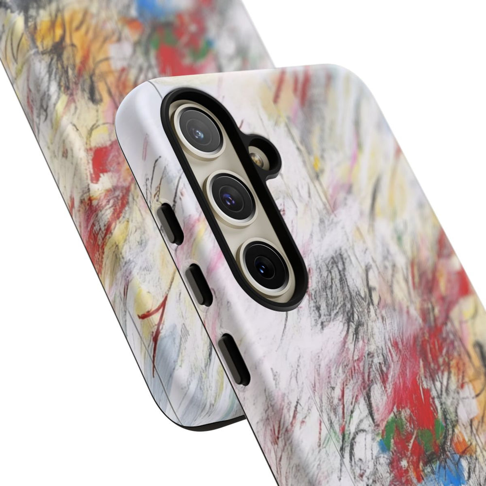 Dit hoesje heeft een abstract ontwerp met dynamische verfstreken en vegen in verschillende kleuren zoals rood, zwart, geel, roze, groen, blauw en grijs op een overwegend witte achtergrond. De energieke, gelaagde streken zorgen voor een gevoel van beweging en textuur. Het matte hoesje heeft een stevige dubbele laag voor extra bescherming en is geschikt voor de Galaxy S24 Plus.