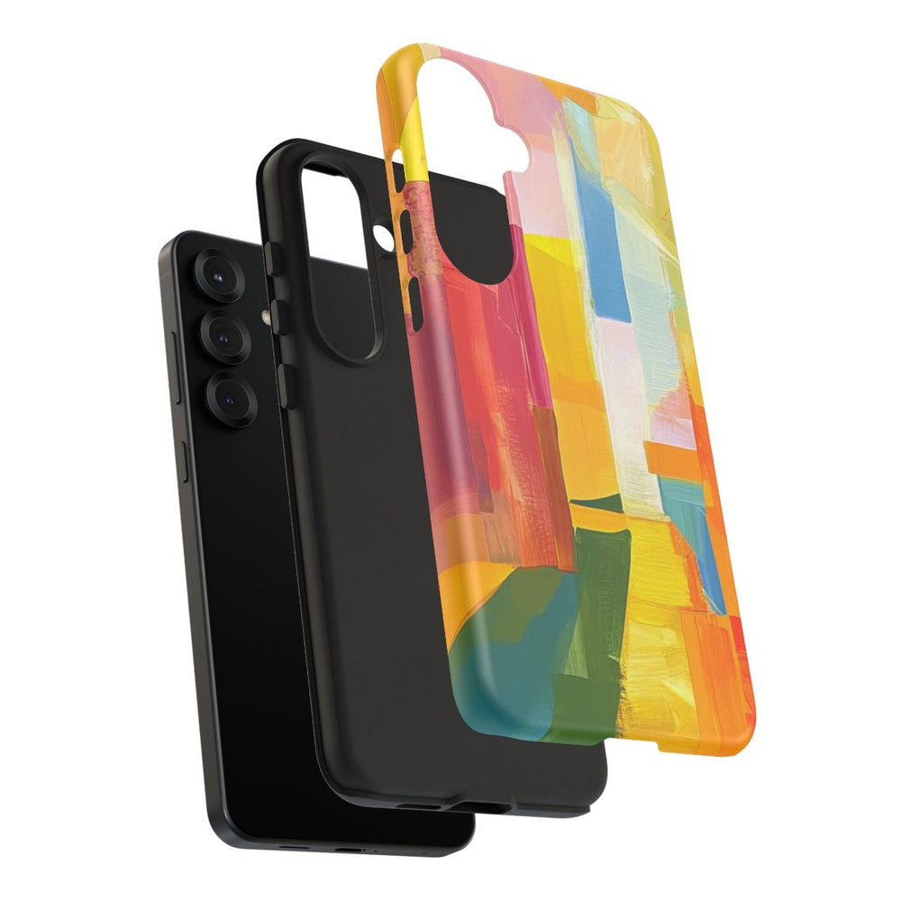 Dit telefoonhoesje heeft een abstract ontwerp met levendige verfstreken in verschillende kleuren, zoals geel, oranje, rood, roze, blauw, groen en paars. De verfstreken overlappen en kruisen elkaar, waardoor een dynamisch en speels patroon ontstaat. Het matte hoesje is stevig uitgevoerd met een buitenkant van polycarbonaat en een TPU-binnenlaag voor dubbele bescherming. Daarnaast ondersteunt het hoesje draadloos opladen. Het geheel oogt opvallend en artistiek.