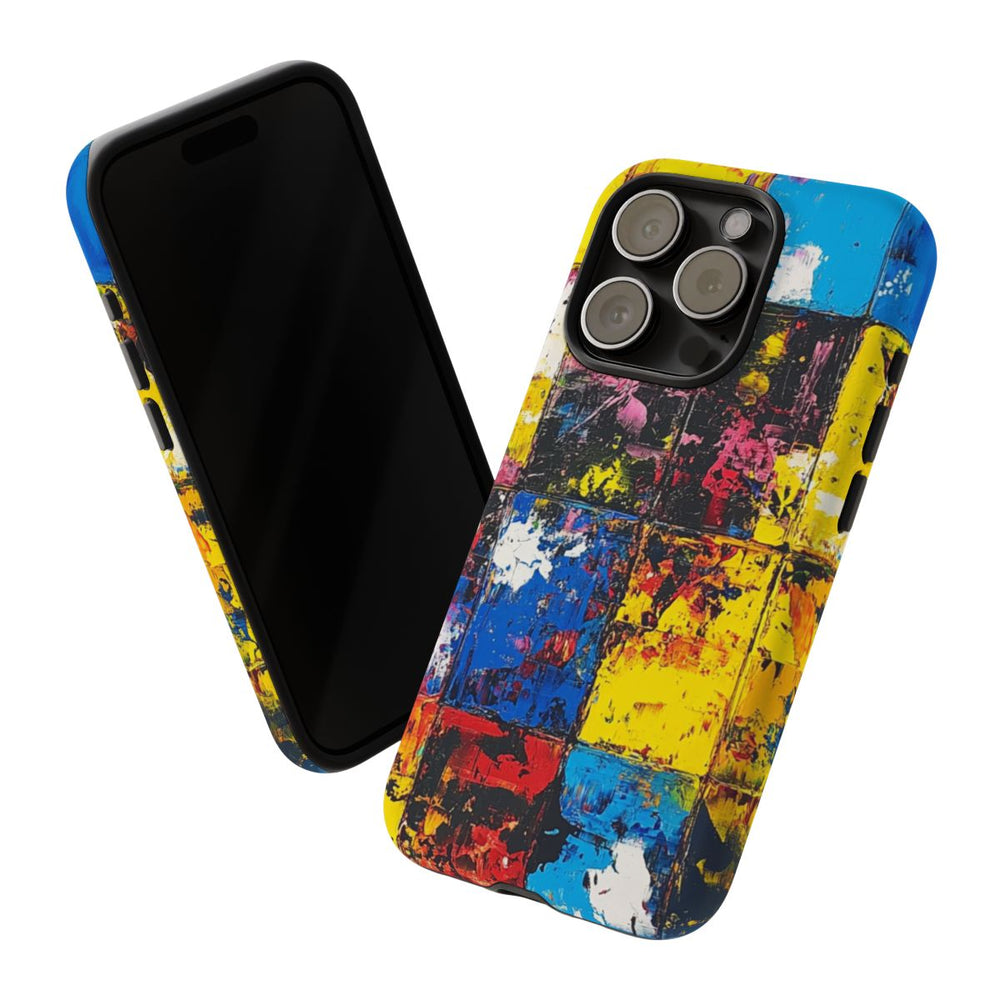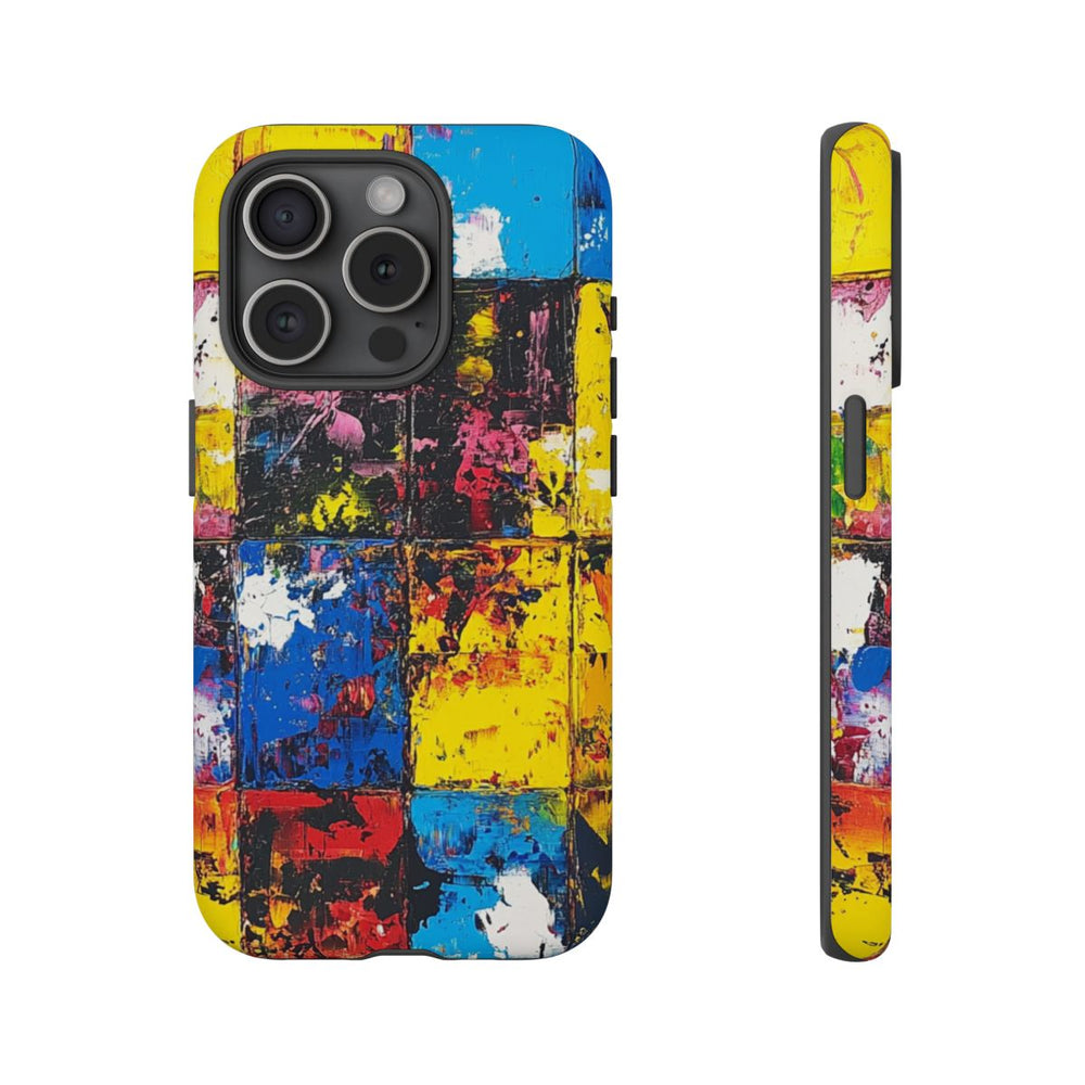 Dit hoesje is voorzien van een abstract schilderij opgebouwd uit een raster van vierkanten, elk gevuld met levendige, gestructureerde kleuren. De vierkanten tonen een combinatie van geel, blauw, rood, roze, groen, wit, zwart en oranje, waarbij zichtbare penseelstreken en verfspatten zorgen voor een dynamische en energieke uitstraling. De ruwe textuur en het krachtige kleurcontrast geven het geheel een levendig en expressief karakter. Dit matte, stevige hoesje bestaat uit twee lagen van polycarbonaat en TPU voor extra duurzaamheid en bescherming, en ondersteunt draadloos opladen.