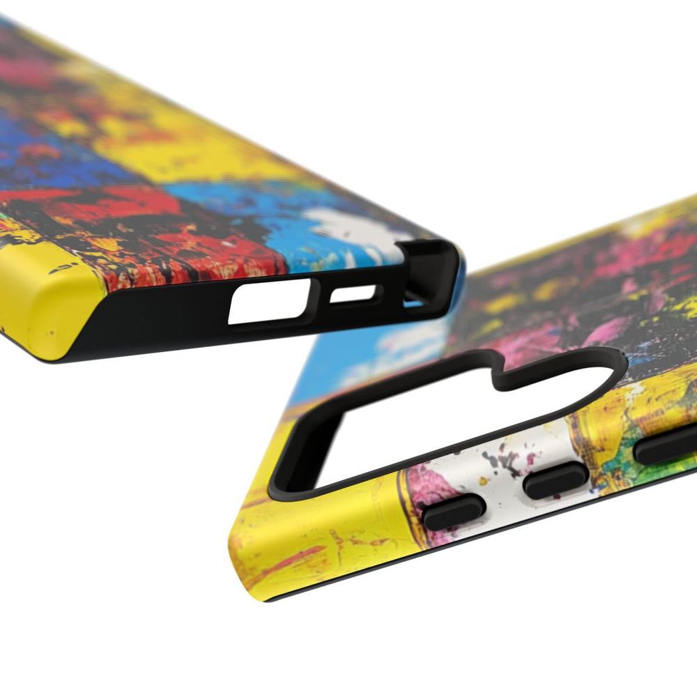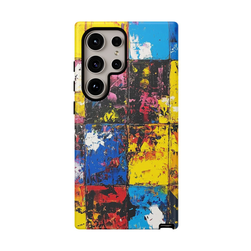 Dit hoesje is voorzien van een abstract schilderij opgebouwd uit een raster van vierkanten, elk gevuld met levendige, gestructureerde kleuren. De vierkanten tonen een combinatie van geel, blauw, rood, roze, groen, wit, zwart en oranje, waarbij zichtbare penseelstreken en verfspatten zorgen voor een dynamische en energieke uitstraling. De ruwe textuur en het krachtige kleurcontrast geven het geheel een levendig en expressief karakter. Dit matte, stevige hoesje bestaat uit twee lagen van polycarbonaat en TPU voor extra duurzaamheid en bescherming, en ondersteunt draadloos opladen.