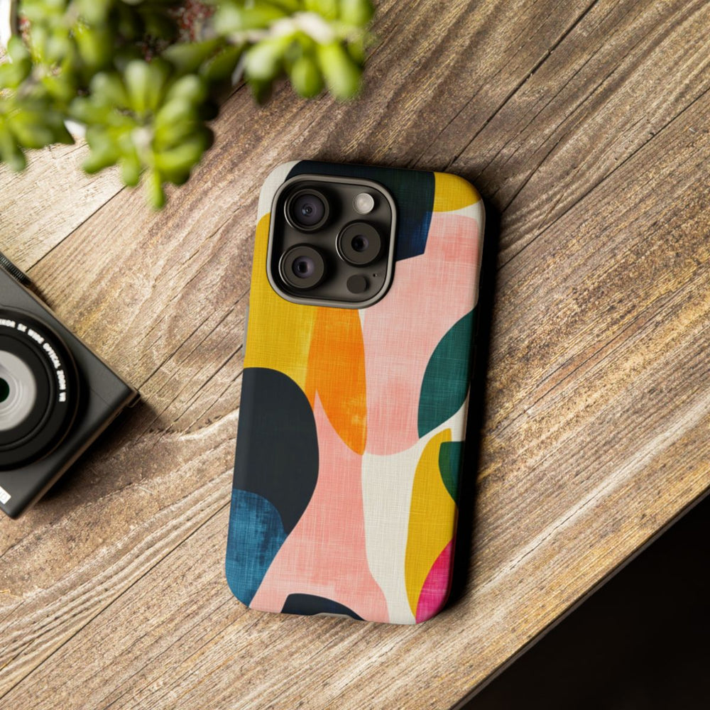 Dit telefoonhoesje heeft een abstract patroon met grote, onregelmatige vormen in diverse kleuren zoals donker marineblauw, mosterdgeel, oranje, roze en groen. De vormen overlappen elkaar op een licht getextureerde, gebroken witte achtergrond, wat zorgt voor een dynamische en moderne uitstraling. Het patroon heeft een geschilderde, licht verweerde textuur die extra diepte en karakter geeft. Het ontwerp is gedrukt op een matte, stevige hoes met dubbele laag van polycarbonaat en TPU, wat zorgt voor extra stevigheid en bescherming. Geschikt voor draadloos opladen.
