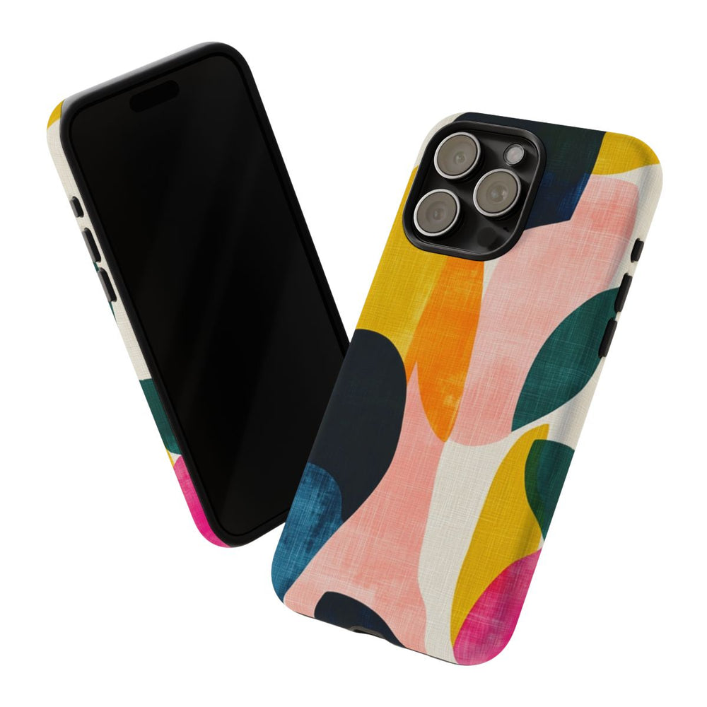 Dit telefoonhoesje heeft een abstract patroon met grote, onregelmatige vormen in diverse kleuren zoals donker marineblauw, mosterdgeel, oranje, roze en groen. De vormen overlappen elkaar op een licht getextureerde, gebroken witte achtergrond, wat zorgt voor een dynamische en moderne uitstraling. Het patroon heeft een geschilderde, licht verweerde textuur die extra diepte en karakter geeft. Het ontwerp is gedrukt op een matte, stevige hoes met dubbele laag van polycarbonaat en TPU, wat zorgt voor extra stevigheid en bescherming. Geschikt voor draadloos opladen.