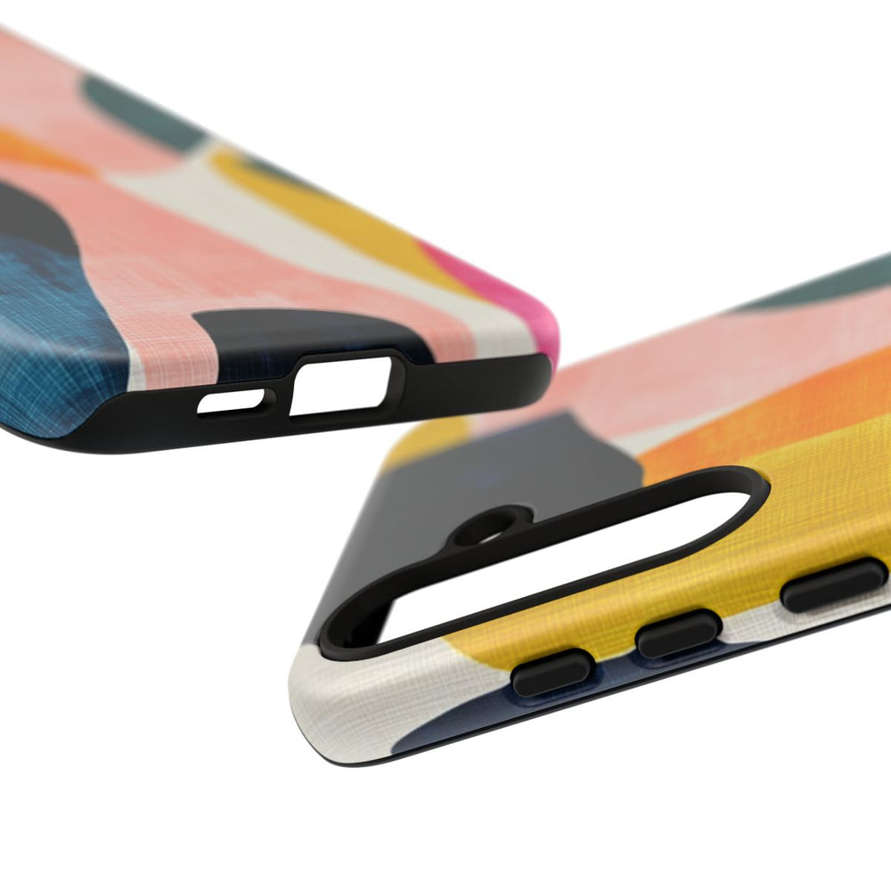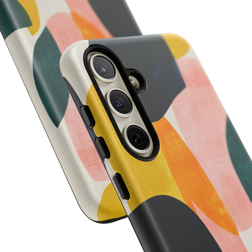 Dit telefoonhoesje heeft een abstract patroon met grote, onregelmatige vormen in diverse kleuren zoals donker marineblauw, mosterdgeel, oranje, roze en groen. De vormen overlappen elkaar op een licht getextureerde, gebroken witte achtergrond, wat zorgt voor een dynamische en moderne uitstraling. Het patroon heeft een geschilderde, licht verweerde textuur die extra diepte en karakter geeft. Het ontwerp is gedrukt op een matte, stevige hoes met dubbele laag van polycarbonaat en TPU, wat zorgt voor extra stevigheid en bescherming. Geschikt voor draadloos opladen.