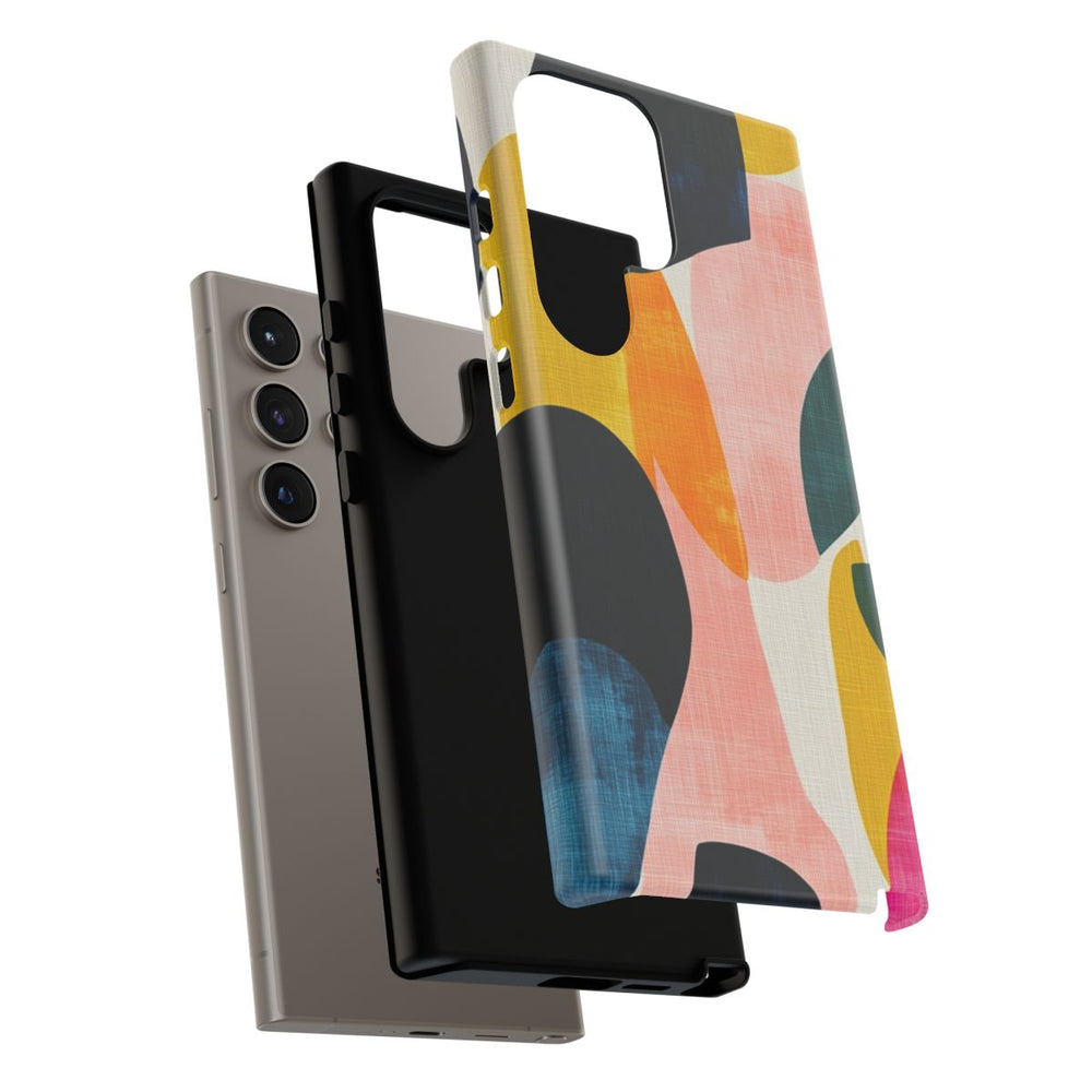 Dit telefoonhoesje heeft een abstract patroon met grote, onregelmatige vormen in diverse kleuren zoals donker marineblauw, mosterdgeel, oranje, roze en groen. De vormen overlappen elkaar op een licht getextureerde, gebroken witte achtergrond, wat zorgt voor een dynamische en moderne uitstraling. Het patroon heeft een geschilderde, licht verweerde textuur die extra diepte en karakter geeft. Het ontwerp is gedrukt op een matte, stevige hoes met dubbele laag van polycarbonaat en TPU, wat zorgt voor extra stevigheid en bescherming. Geschikt voor draadloos opladen.