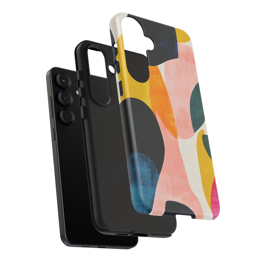Dit telefoonhoesje heeft een abstract patroon met grote, onregelmatige vormen in diverse kleuren zoals donker marineblauw, mosterdgeel, oranje, roze en groen. De vormen overlappen elkaar op een licht getextureerde, gebroken witte achtergrond, wat zorgt voor een dynamische en moderne uitstraling. Het patroon heeft een geschilderde, licht verweerde textuur die extra diepte en karakter geeft. Het ontwerp is gedrukt op een matte, stevige hoes met dubbele laag van polycarbonaat en TPU, wat zorgt voor extra stevigheid en bescherming. Geschikt voor draadloos opladen.
