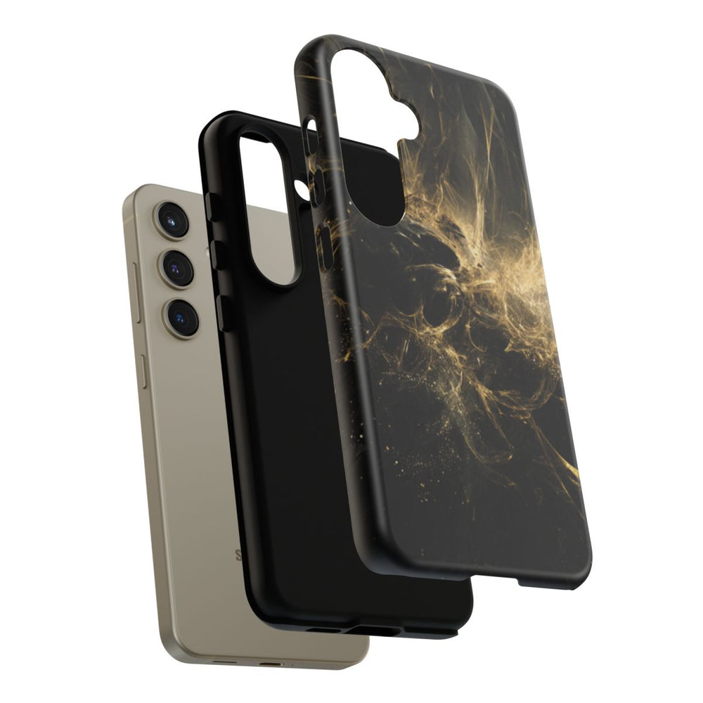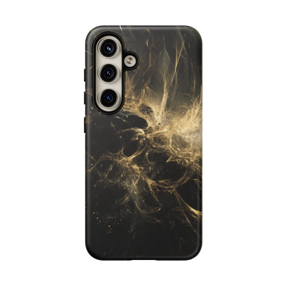 Dit ontwerp toont een abstracte samenstelling van golvende zwarte en gouden elementen die doen denken aan kosmisch stof en lichtstralen. De afbeelding heeft een donkere achtergrond met verfijnde gouden accenten en fijne details, wat zorgt voor diepte en beweging. Het hoesje bestaat uit twee lagen met een matte afwerking en is gemaakt van polycarbonaat en TPU. Het ondersteunt draadloos opladen en biedt bescherming tegen invloeden van buitenaf.