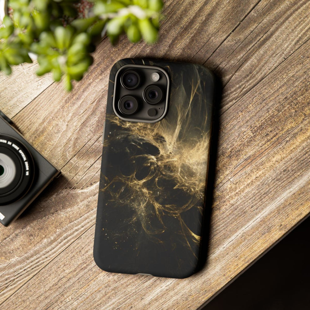 Dit telefoonhoesje heeft een abstract kosmisch ontwerp met wervelende gouden en zwarte elementen. Fijne, golvende patronen van goudkleurige draden en stof komen prachtig tot hun recht tegen een diepe zwarte achtergrond, wat zorgt voor een gevoel van diepte en beweging. Het hoesje heeft een matte afwerking en bestaat uit een stevige polycarbonaat buitenkant met een TPU-binnenzijde voor extra duurzaamheid en bescherming. Geschikt voor draadloos opladen.