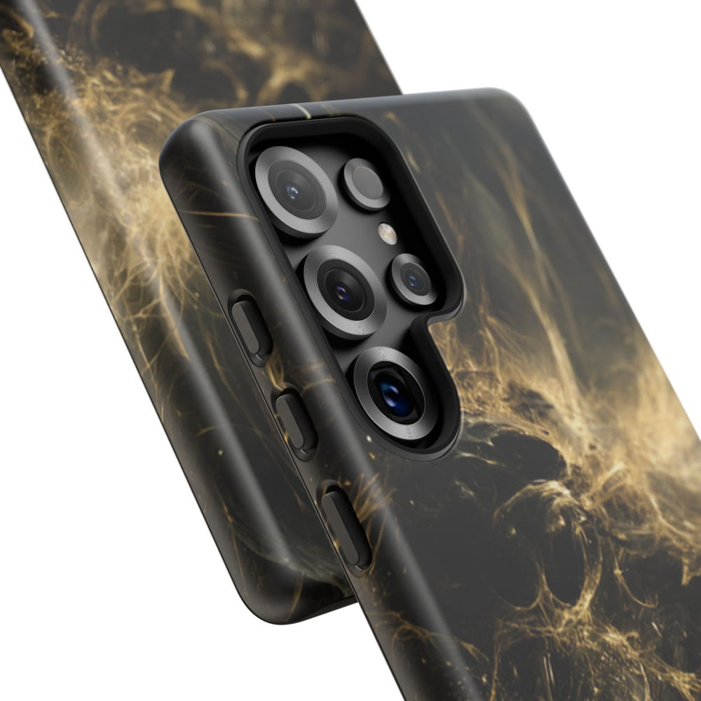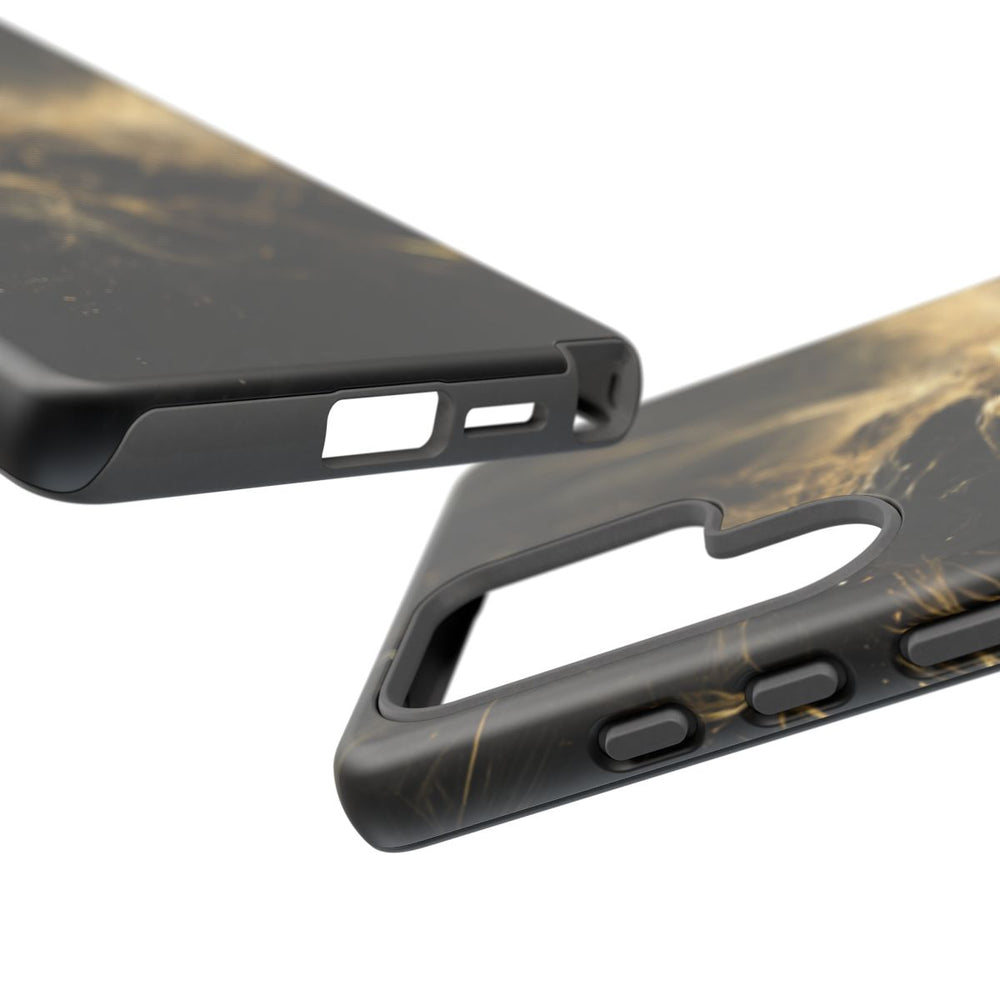 Dit hoesje is voorzien van een abstract ontwerp met draaiende zwarte en gouden elementen die doen denken aan kosmisch stof en lichtstrepen. De donkere achtergrond met verfijnde gouden accenten zorgt voor diepte en beweging. Het hoesje bestaat uit twee lagen: een stevige polycarbonaat buitenkant en een TPU-binnenzijde, wat zorgt voor extra duurzaamheid en bescherming, ook buitenshuis. Geschikt voor draadloos opladen.