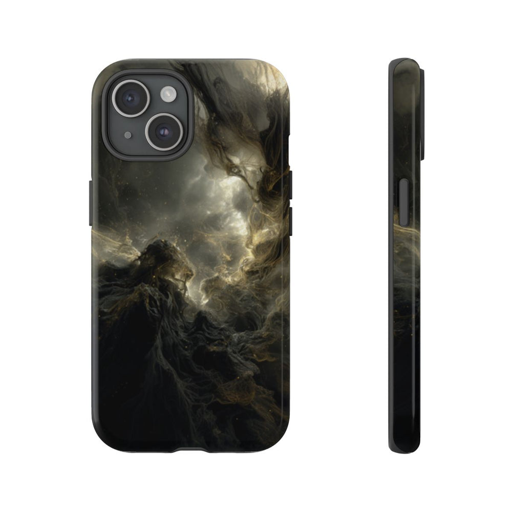 Dit telefoonhoesje heeft een abstract ontwerp met wervelende schaduwen en lichtstrengen in donkere en goudkleurige tinten. De vloeiende, verstrengelde vormen zorgen voor diepte en beweging tegen een donkere achtergrond. Oplichtende gouden deeltjes geven extra contrast en structuur. Het hoesje is glanzend, stevig en bestaat uit een polycarbonaat buitenkant met een TPU-binnenzijde, waardoor het duurzaam is en geschikt voor gebruik buitenshuis. Ondersteunt draadloos opladen.