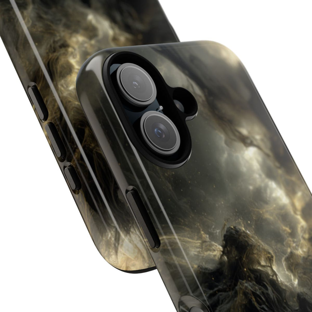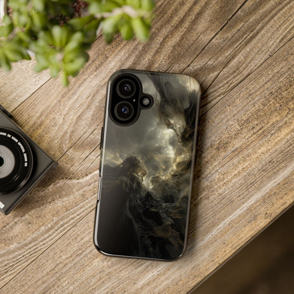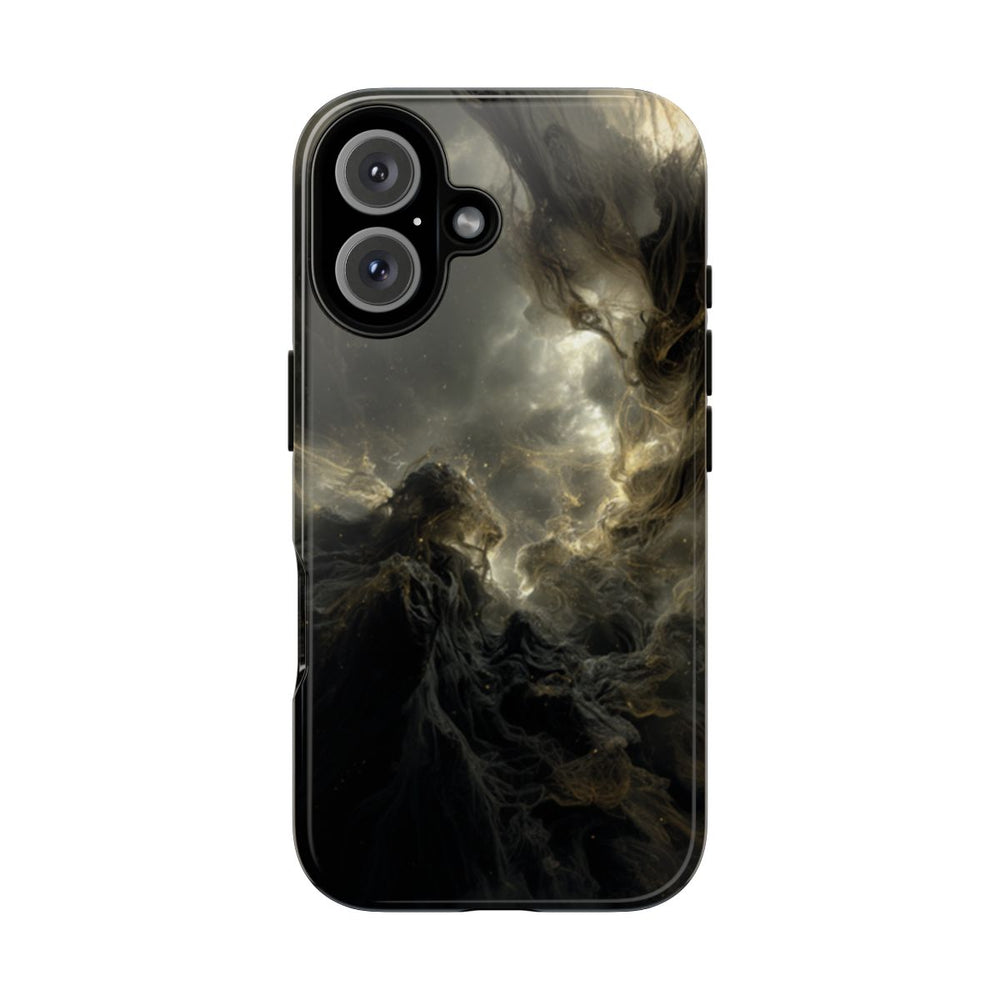 Dit telefoonhoesje heeft een abstract ontwerp met wervelende schaduwen en lichtstrengen in donkere en goudkleurige tinten. De vloeiende, verstrengelde vormen zorgen voor diepte en beweging tegen een donkere achtergrond. Oplichtende gouden deeltjes geven extra contrast en structuur. Het hoesje is glanzend, stevig en bestaat uit een polycarbonaat buitenkant met een TPU-binnenzijde, waardoor het duurzaam is en geschikt voor gebruik buitenshuis. Ondersteunt draadloos opladen.